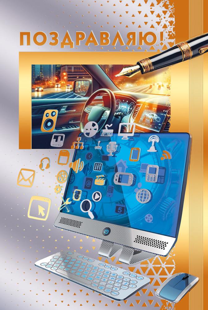 Открытка формата А5 предназначена для вручения в качестве универсального поздравления, в том числе по случаю профессиональных и личных достижений, связанных с современными технологиями, офисной работой или деловой сферой. Изделие изготовлено из плотного картона, что обеспечивает стабильную форму, устойчивость к изгибам и удобство хранения в стандартных стеллажах и витринных лотках. Габаритные размеры готовой открытки составляют 182 × 122 мм, что соответствует распространённым конвертам и упрощает планирование сопутствующего ассортимента. На лицевой стороне размещена композиция с изображением монитора, клавиатуры, компьютерной мыши и салона автомобиля на фоне ночного города, дополненная надписью «ПОЗДРАВЛЯЮ!», что делает оформление уместным для деловых партнёров, сотрудников, специалистов IT‑сферы, водителей, менеджеров и других категорий, связанных с цифровыми и транспортными технологиями. Внутри предусмотрен готовый поздравительный текст, позволяющий использовать открытку без дополнительной доработки, что важно при массовых вручениях и корпоративных закупках. Печать выполнена с применением золотой фольги и серебряного пантона, за счёт чего отдельные элементы дизайна имеют выраженный металлический блеск и хорошо читаются при искусственном и дневном освещении, сохраняя презентабельный вид при длительном хранении. Поверхность открытки устойчива к умеренным механическим воздействиям, не выцветает при кратковременном воздействии света, что удобно для выкладки в торговом зале и при транспортировке на дальние расстояния. В упаковке 10 одинаковых экземпляров, что позволяет эффективно планировать оптовые поставки, формировать однородные партии для корпоративных мероприятий и сокращать время на подбор единичных позиций. Открытка подходит для использования как самостоятельный элемент поздравления или в комплекте с подарком, легко размещается в конверте или подарочном пакете и обеспечивает аккуратное визуальное решение без необходимости дополнительного оформления.