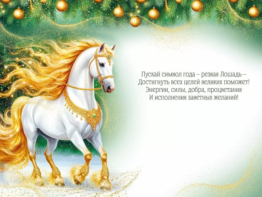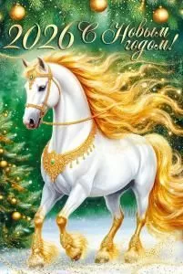 Открытка «С Новым годом! 2026» в формате А5 станет прекрасным дополнением к подарку и украсит всеми любимый праздник. Чудесный дизайн преобразит новогоднее поздравление! Белоснежная лошадь с золотой гривой, изображенная на изделии, является символом Нового 2026 года и будет ярким пожеланием процветания и благополучия. Внутри открытки – замечательные стихи с теплыми пожеланиями. Такой презент можно вручить в дополнение к основному подарку, чтобы украсить поздравление и сделать его более оригинальным. Изделие выполнено из качественных материалов, что обеспечивает ему прочность и долговечность, поэтому оно станет чудесным памятным сувениром для получателя.
