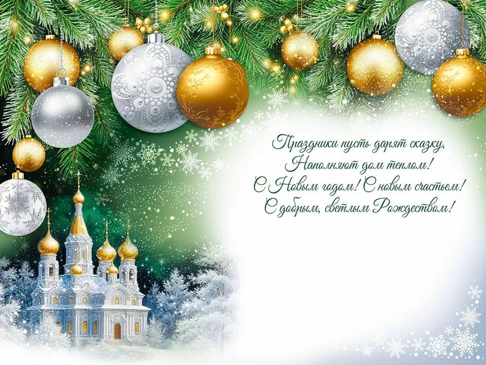 Открытка «С Новым годом и Рождеством!» в формате А5 станет прекрасным дополнением к подарку и украсит всеми любимый праздник. Волшебный дизайн преобразит новогоднее поздравление! Изделие украшено изображением белоснежного храма с золотыми куполами среди заснеженных деревьев. Сочетание зеленых и золотых оттенков делает общий внешний вид стильным и элегантным. Внутри открытки – замечательные стихи с теплыми пожеланиями. Такой презент можно вручить в дополнение к основному подарку, чтобы украсить поздравление и сделать его более оригинальным. Изделие выполнено из качественных материалов, что обеспечивает ему прочность и долговечность, поэтому оно станет чудесным памятным сувениром для получателя.