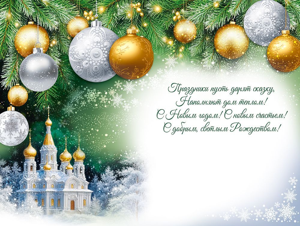 Открытка формата А5 предназначена для новогодних и рождественских поздравлений и ориентирована на использование в розничной продаже и оптовых поставках для торговых сетей, канцелярских отделов и корпоративных заказчиков. Изделие изготовлено из плотного картона, обеспечивающего устойчивость к изгибам и истиранию при хранении, транспортировке и пересылке почтой. Лицевая сторона оформлена полноцветным изображением зимнего храма на фоне заснеженного пейзажа и еловых ветвей с декоративными шарами, что делает открытку подходящей для поздравлений в традиционной новогодне‑рождественской тематике как в личной, так и в деловой переписке. Поверхность дополнительно обработана глянцевым УФ-лаком, за счёт чего изображение приобретает выразительный блеск, устойчиво к выцветанию и сохраняет чёткость красок при длительном хранении в витринах и на складе. Внутри предусмотрен готовый поздравительный текст, что сокращает время подготовки массовых рассылок и удобно при крупных корпоративных закупках; при необходимости остаётся свободное место для рукописного дополнения. Габаритные размеры готового изделия 182 × 122 мм позволяют размещать открытку в стандартных почтовых конвертах соответствующего формата и оптимизировать логистику при отправке больших партий. Картонная основа легко штабелируется, открытки не деформируются в упаковке и занимают минимальный объём на складе. Визуальное оформление рассчитано на широкий круг получателей, подходит для поздравления партнёров, клиентов, сотрудников, а также для вручения в семейном кругу и в качестве дополнения к подарку. В одной упаковке — 10.