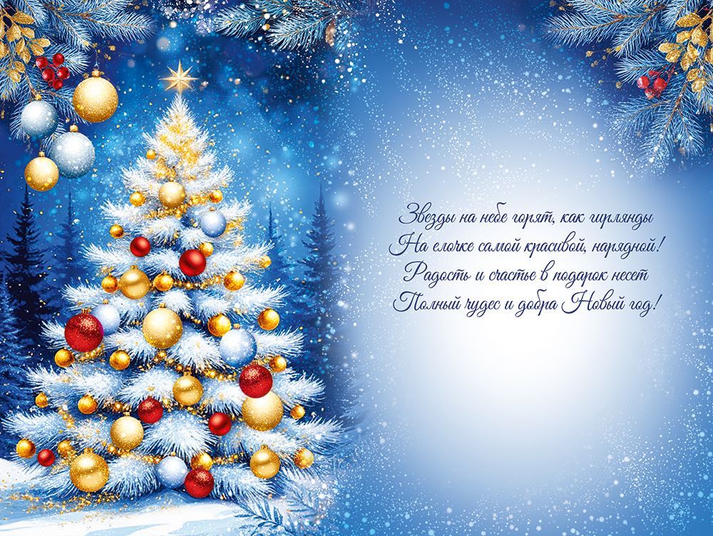 Открытка формата А5 представляет собой горизонтальное складывающееся изделие из плотного картона, предназначенное для поздравления с Новым годом в розничном и корпоративном сегментах. Лицевая сторона оформлена полноцветным изображением зимнего пейзажа с украшенной елью и содержит поздравительную надпись «С Новым годом!», что позволяет использовать открытку без дополнительного оформления. Печать выполнена с применением глянцевого УФ-лака, за счет чего изображение устойчиво к истиранию, сохраняет яркость красок при длительном хранении и многократных тактильных контактах, а поверхность менее подвержена появлению заломов при аккуратном использовании. Готовое изделие имеет размеры 182 × 122 мм, что соответствует стандартному почтовому и конвертному формату, облегчает планирование витринной выкладки, укладки в стеллажи и коробочную транспортную тару, а также совместимость с типовыми конвертами для отправки почтой. Картонная основа обеспечивает достаточную жесткость, открытка не деформируется при пересылке и хранении стопами, что важно при оптовых поставках и формировании ассортимента сезонной полиграфии. Внутри размещен заранее напечатанный поздравительный текст, позволяющий использовать изделие как готовое решение для массовых поздравлений сотрудников, клиентов или партнеров, а также для личных поздравлений, оставляя при этом свободное место для подписи и индивидуального обращения. Нейтральная новогодняя тематика подходит для широкого круга получателей, что упрощает планирование закупок для торговых сетей, офисов и организаций, формирующих универсальный набор праздничных открыток. Упаковка содержит 10 изделий, что удобно при инвентаризации, учете и распределении по торговым точкам, а также при закупке для небольших коллективов и розничного использования.