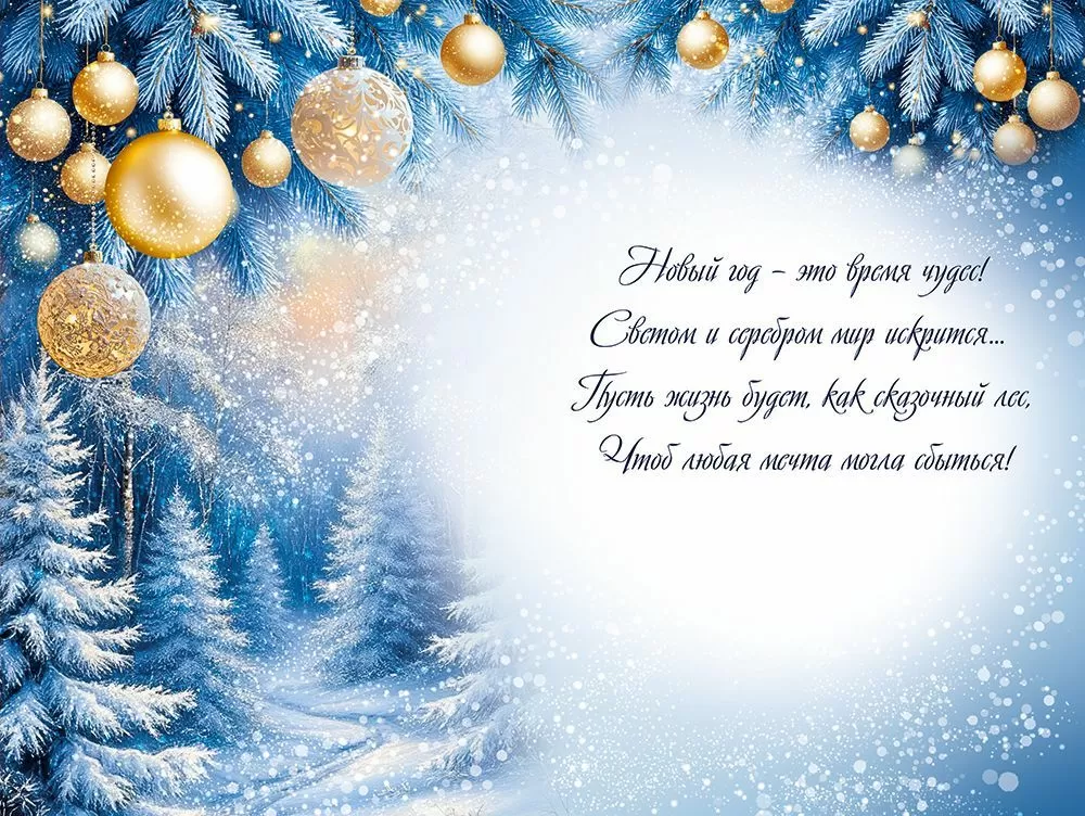 Открытка «С Новым годом!» в формате А5 станет прекрасным дополнением к подарку и украсит всеми любимый праздник. Сказочный дизайн преобразит новогоднее поздравление! На изделии изображен волшебный зимний лес, который дополнен золотыми новогодними шарами. Внутри открытки – замечательные стихи с теплыми пожеланиями. Такой презент можно вручить в дополнение к основному подарку, чтобы украсить поздравление и сделать его более оригинальным. Изделие выполнено из качественных материалов, что обеспечивает ему прочность и долговечность, поэтому оно станет чудесным памятным сувениром для получателя.