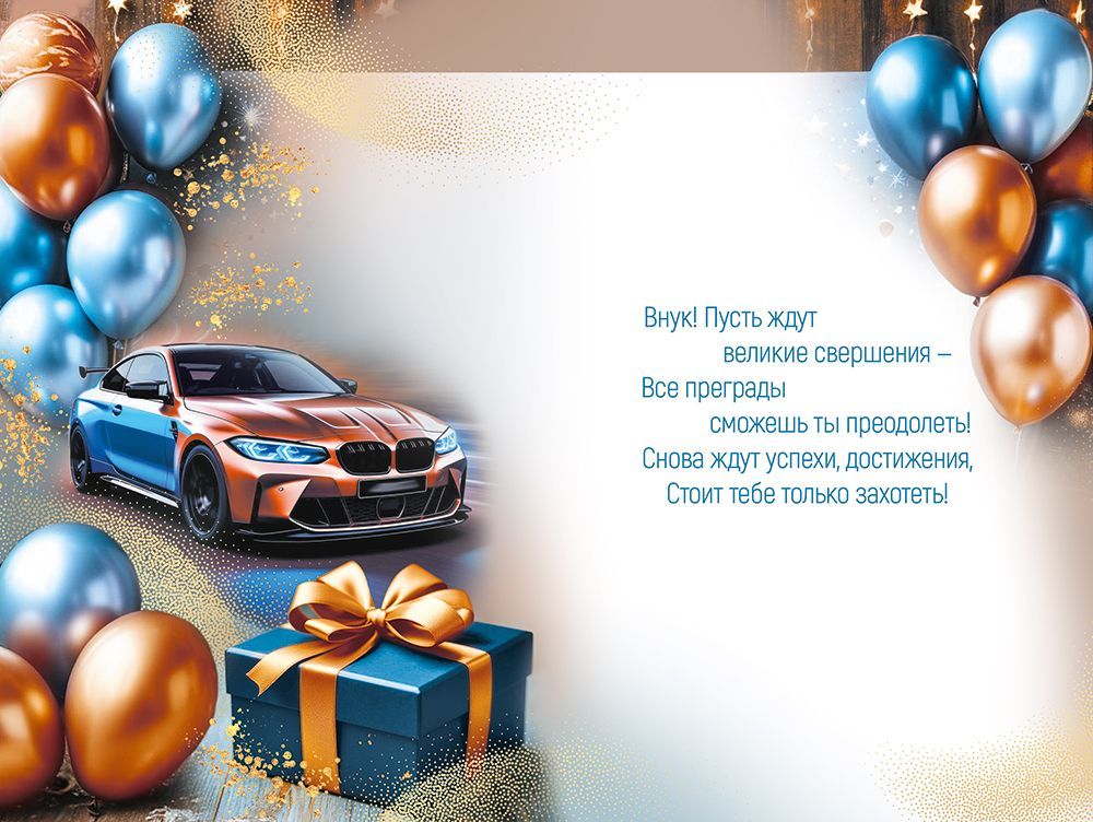 Открытка формата А5 выполнена из плотного картона и предназначена для поздравления внука с днем рождения или другим личным событием. Лицевая сторона оформлена полноцветной печатью с изображением автомобиля спортивного класса, праздничных воздушных шаров и подарочной коробки, что делает изделие актуальным для подростков и молодых мужчин. Текстовая часть на обложке содержит обращение «Внуку. Удачи! Успеха!», внутри размещено поздравление, позволяющее использовать открытку как готовое решение без необходимости дополнительного оформления. Золотая фольга применяется для выборочного тиснения отдельных элементов дизайна, за счет чего поверхность имеет аккуратные глянцевые акценты, устойчивые к истиранию при стандартной эксплуатации и транспортировке. Размер готового изделия 182 × 122 мм обеспечивает совместимость с большинством стандартных почтовых конвертов соответствующего формата и удобство выкладки в торговом оборудовании. Картонная основа сохраняет форму, не деформируется при вертикальной расстановке на полке и выдерживает многократное перелистывание в торговом зале, что важно при оптовых поставках и длительном хранении. Полиграфическое исполнение рассчитано на серийное использование в розничном ассортименте: универсальная тематическая направленность, нейтральная цветовая гамма в сине-золотых тонах и современный сюжет позволяют включать открытку в базовую матрицу поздравительной продукции для магазинов широкого профиля, книжных сетей и киосков. В упаковке 10 штук, что удобно для планирования закупок, формирования витрин и поддержания стабильного наличия ходовой позиции в ассортименте.