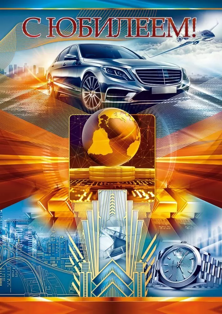 Открытка «С юбилеем!» в формате А4 станет прекрасным дополнением к любому подарку. Динамичный стильный дизайн сделает любое поздравление незабываемым! Сочетание синего и ярко-оранжевого оттенков делает внешний вид изделия контрастным и привлекающим внимание. Четкие изображения автомобиля, наручных часов, самолеты символизируют успех, стремление и силу. Внутри открытки – замечательные стихи с теплыми пожеланиями. Такой презент можно вручить в дополнение к основному подарку, чтобы украсить поздравление и сделать его более оригинальным. Изделие выполнено из качественных материалов, что обеспечивает ему прочность и долговечность, поэтому оно станет чудесным памятным сувениром для получателя.