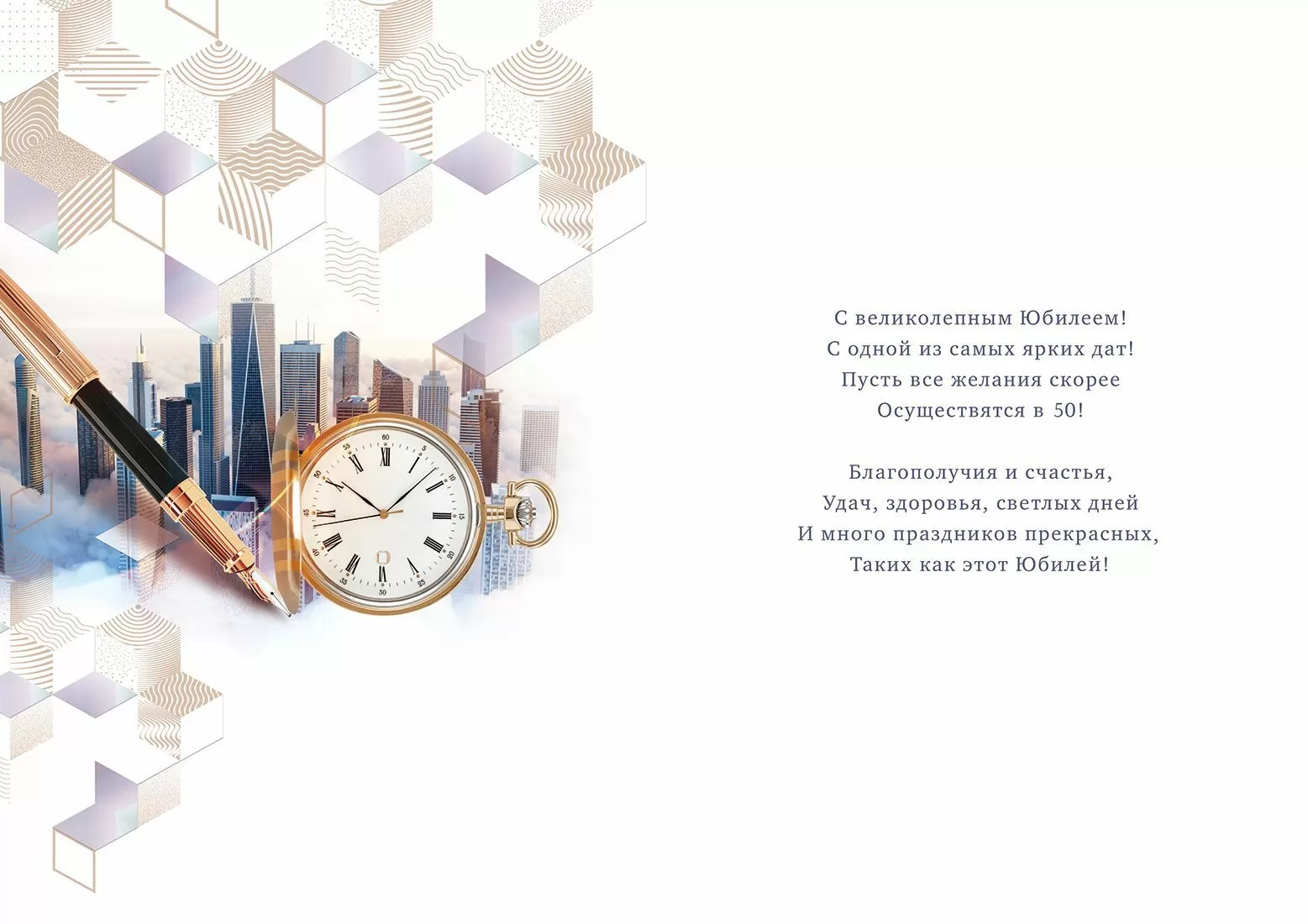 Открытка «С юбилеем! 50 лет» в формате А4 станет прекрасным дополнением к любому подарку. Лаконичный и стильный дизайн сделает любое поздравление незабываемым! Светлые оттенки в сочетании с золотой фольгой делают внешний вид изделия изысканным и контрастным. Изображения золотых часов и перьевой ручки на фоне небоскребов символизируют успех и благополучие. Внутри открытки – замечательные стихи с теплыми пожеланиями. Такой презент можно вручить в дополнение к основному подарку, чтобы украсить поздравление и сделать его более оригинальным. Изделие выполнено из качественных материалов, что обеспечивает ему прочность и долговечность, поэтому оно станет чудесным памятным сувениром для получателя.