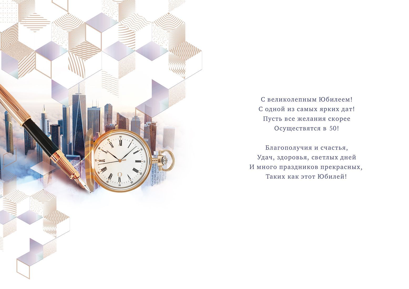 Открытка формата А4 предназначена для поздравления с юбилеем 50 лет и ориентирована на мужскую аудиторию делового стиля. Изделие выполнено из плотного картона, что обеспечивает устойчивость к деформациям при хранении, транспортировке и передаче получателю. Лицевая сторона оформлена крупной надписью «С Юбилеем! 50» на фоне городской архитектуры, моста и элементов деловой атрибутики — автомобиля, классических часов, перьевой ручки, что визуально подчёркивает тематику успеха, статуса и достижений. Дополнительный декоративный эффект создаёт золотая фольга, используемая в оформлении надписей и отдельных графических элементов: она повышает износостойкость печати к истиранию и придаёт изображению выразительный, но сдержанный блеск, удобный для выкладки в витринах и на стеллажах. Внутри размещён готовый поздравительный текст, что сокращает время подготовки к вручению и делает позицию востребованной для розничных покупателей, приобретающих открытку в последний момент. Габариты готового изделия 277 × 196 мм позволяют использовать стандартные конверты соответствующего формата и обеспечивают хорошую заметность на полке. Открытка подходит для формирования ассортимента к юбилейным датам в магазинах подарков, книжных и канцелярских отделах, а также для закупок корпоративными клиентами для поздравления сотрудников и партнёров. Материал и формат удобны для штабелирования, хранения в коробах и транспортировки без дополнительной защиты. В упаковке 10 штук, что оптимально для оптовых и мелкооптовых поставок, позволяет планировать выкладку по нескольким торговым точкам и поддерживать стабильный остаток на складе в период повышенного спроса на юбилейную продукцию.
