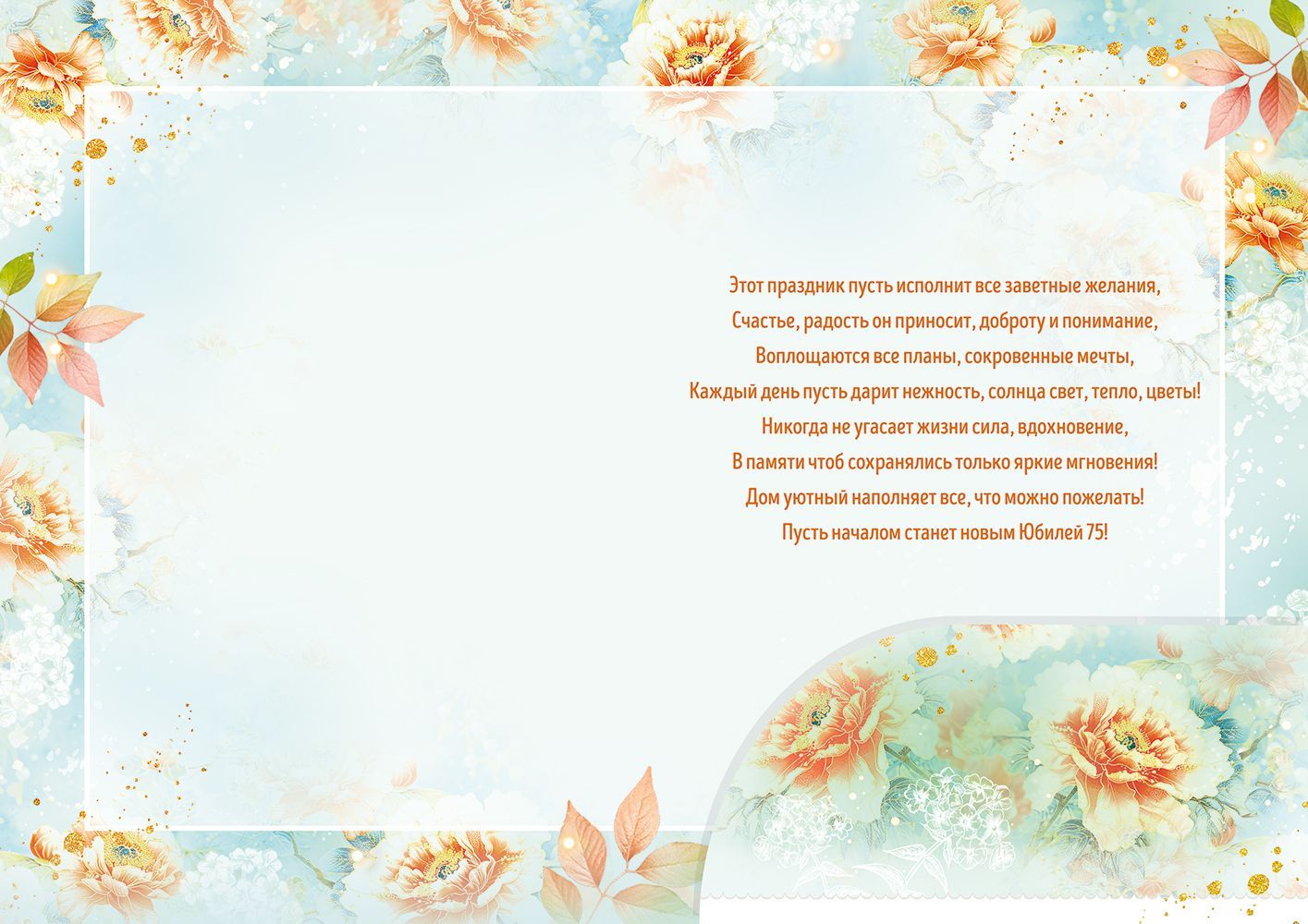 Открытка формата А4 изготовлена из плотного картона, что обеспечивает стабильную форму изделия при транспортировке, хранении и вручении. Размер готового изделия 277 × 196 мм позволяет использовать открытку как самостоятельный поздравительный атрибут без дополнительного декора, а также удобно размещать её в стандартных упаковочных и почтовых конвертах соответствующего формата. Лицевая сторона оформлена цветной печатью с крупной золотистой надписью «75» и поздравлением «С юбилеем!», центральную часть занимает детализированное изображение букета пионов и роз в плетёной корзине на мягком пастельном фоне. Дополнительный визуальный акцент создают золотые блёстки в лаке, нанесённые точечно по композиции, что повышает износостойкость изображения в местах наибольшего контакта и придаёт поверхности лёгкий рельеф. Внутри предусмотрен готовый поздравительный текст, согласованный с тематикой юбилея 75 лет, что сокращает время подготовки к вручению и делает изделие удобным для розничного покупателя. Для оптовых клиентов открытка представляет интерес как позиция с предсказуемыми параметрами качества: однородный картон, чёткая печать без смещения, стабильные размеры, позволяющие формировать аккуратные стопы при складском хранении и выкладке. Партия из 10 штук оптимальна для формирования полочного ассортимента к юбилейным датам, планирования закупок под сезонный спрос и комплектования подарочных наборов. Дизайн универсален по гендеру и подходит для поздравления родственников, коллег и партнёров старшего возраста, а нейтральная цветовая гамма и классический сюжет с цветами и сервировкой стола делают открытку применимой в широком спектре бытовых и корпоративных сценариев.
