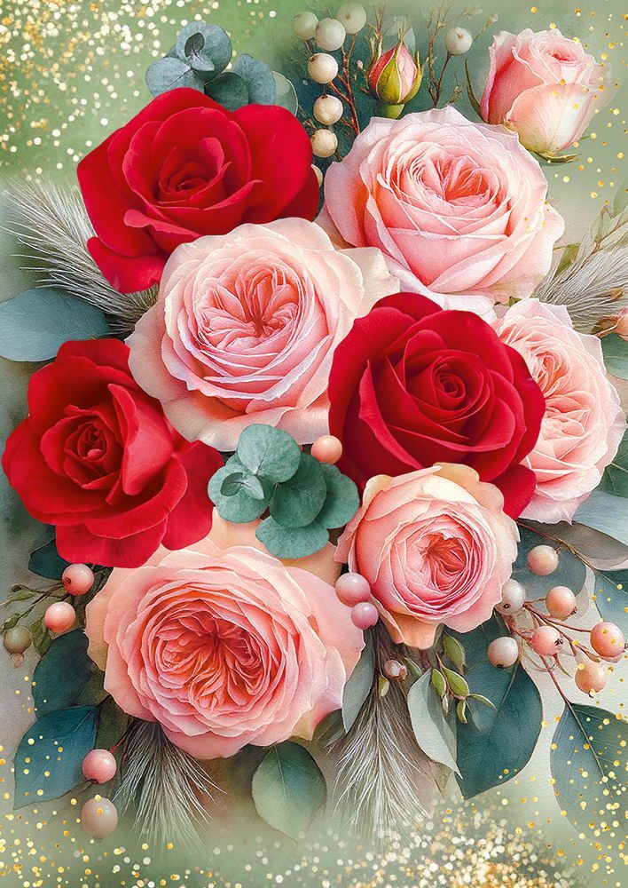 Открытка формата А4 выполнена из плотного картона и предназначена для широкого ассортимента розничных и оптовых поставок. Лицевая сторона оформлена полноцветным изображением крупного цветочного букета с розами разных оттенков, декоративной зеленью и ягодами, по краям композиции нанесены радужные блестки в лаке, создающие аккуратный мерцающий эффект при искусственном и дневном освещении. Отсутствие надписей делает изделие универсальным: открытка может использоваться для поздравлений с днем рождения, юбилеем, свадьбой, профессиональными праздниками, а также как вложение к подарочным наборам или цветам. Гладкая поверхность картона обеспечивает устойчивость печати к истиранию, не подвержена быстрому выцветанию при стандартных условиях хранения и эксплуатации, что важно при длительном нахождении товара на витрине. Размер готового изделия 277 × 196 мм позволяет размещать внутри развернутый текст поздравления, фирменные штампы или логотипы, а также при необходимости вкладывать дополнительные рекламные материалы. Формат удобен для транспортировки и складирования: открытка помещается в стандартные файлы и конверты соответствующего размера, легко группируется в стопки без деформации краев. Картонная основа сохраняет геометрию изделия при многократных перекладываниях, что снижает риск брака в оптовых партиях. Нейтральная цветочная тематика подходит для круглогодичного ассортимента и может использоваться как в розничных магазинах подарков и канцелярии, так и в корпоративных закупках для поздравления сотрудников и партнеров. В упаковке 10 изделий, что удобно для планирования полочного запаса, формирования наборов и равномерного распределения по торговым точкам.