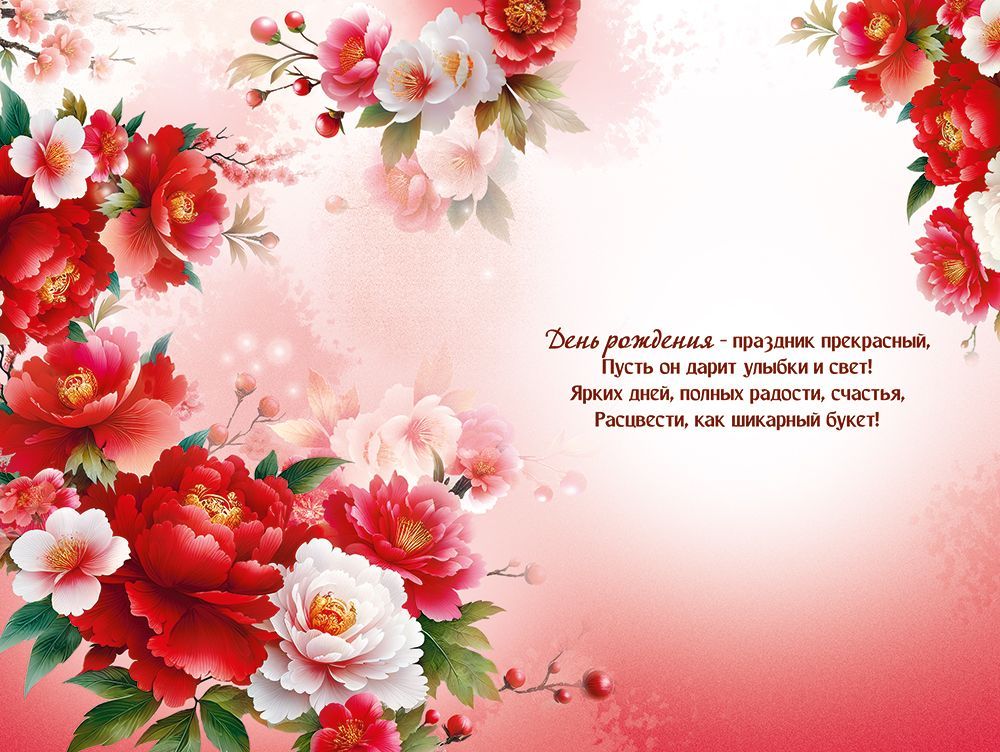 Открытка формата А5 предназначена для оформления поздравлений с днем рождения и рассчитана на использование в розничной продаже и оптовых поставках. Изделие изготовлено из плотного картона, что обеспечивает стабильную геометрию, устойчивость к изгибам и сохранение внешнего вида при транспортировке и хранении в стандартных коробах и стеллажных системах. Готовое изделие имеет длину 182 мм и ширину 122 мм, размеры подобраны под распространённые почтовые и подарочные конверты, что упрощает логистику и использование в торговых точках. Лицевая сторона оформлена полноцветной печатью с детализированным изображением крупных декоративных цветов на градиентном розово-персиковом фоне и поздравительной надписью «С Днем рождения!», что делает открытку универсальной для поздравления женщин и широкого круга получателей. Внутри предусмотрен готовый поздравительный текст, позволяющий применять изделие без дополнительной доработки и экономить время конечного пользователя; наличие текста удобно для торговых сетей, где востребованы решения «готовые к вручению». Отделка включает блестки в лаке радужные, нанесенные выборочно по отдельным элементам рисунка, за счет чего поверхность имеет легкий декоративный эффект при изменении угла освещения, при этом структура покрытия устойчива к истиранию при аккуратном обращении и не осыпается при стандартных условиях перевозки. Плотный картон и лаковый слой способствуют сохранению яркости красок, устойчивости к выцветанию при кратковременном воздействии света в витринной выкладке. Конструкция открытки удобна для выкладки на полке и в настольных дисплеях, изделие подходит для формирования ассортимента поздравительной продукции в книжных магазинах, супермаркетах, салонах подарков и интернет-торговле. В упаковке 10 штук, что оптимально для планирования закупок, учета остатков и равномерного пополнения ассортимента в торговых точках различного формата.
