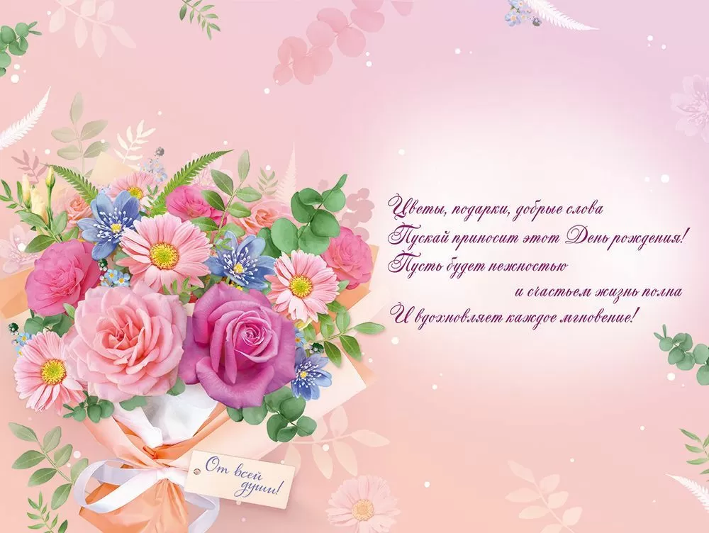 Открытка «С Днем рождения» в формате А5 станет прекрасным дополнением к подарку и преобразит поздравление. Нежный романтичный дизайн обязательно порадует всех! На изделии изображен чудесный букет в золотой упаковке. Внутри открытки – замечательные стихи с теплыми пожеланиями. Такой презент можно вручить в дополнение к основному подарку, чтобы украсить поздравление и сделать его более оригинальным. Изделие выполнено из качественных материалов, что обеспечивает ему прочность и долговечность, поэтому оно станет чудесным памятным сувениром для получателя.