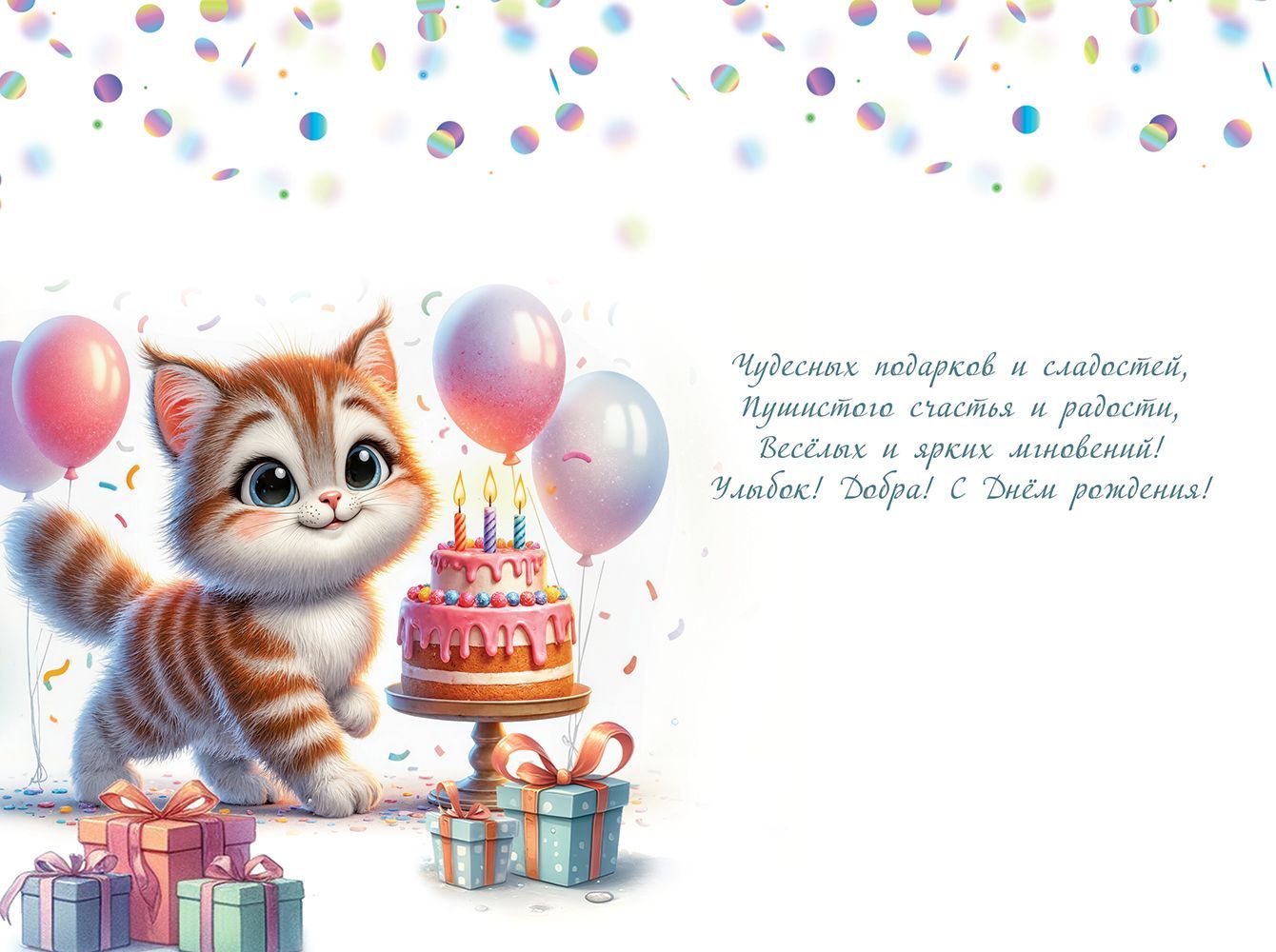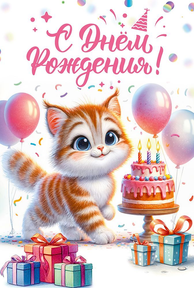 Открытка формата А5 предназначена для оформления поздравлений с днём рождения и ориентирована на массовое использование в розничных и корпоративных сценариях. Изделие изготовлено из плотного картона, обеспечивающего устойчивость к изгибам и истиранию при транспортировке, выкладке и хранении на стеллажах. Лицевая сторона оформлена полноцветным изображением: праздничная композиция с тортом, воздушными шарами, подарками и персонажем котёнка, дополненная крупной надписью «С Днём рождения!». Внутри предусмотрен готовый поздравительный текст, что сокращает время обслуживания клиентов в торговых точках и упрощает использование открытки в быту, при проведении детских и семейных праздников, вручении подарков коллегам и партнёрам. Размер готового изделия 182 × 122 мм позволяет размещать открытку в стандартных конвертах соответствующего формата и удобно комплектовать её с подарками различного типа. Поверхность лицевой стороны имеет глянцевое покрытие УФ-лаком, за счёт чего изображение устойчиво к выцветанию, менее подвержено появлению следов от прикосновений и сохраняет чёткость линий при длительной витринной экспозиции. Такая обработка облегчает сухую очистку поверхности от пыли и делает открытку технологичной при хранении в стопах и коробах, снижая риск повреждения печатного слоя. В упаковке 10 штук, что удобно для оптовых закупок, формирования ассортиментных матриц и равномерной выкладки по торговым точкам. Универсальный тематический дизайн ориентирован преимущественно на детскую и молодёжную аудиторию, но подходит для широкого круга получателей, что позволяет использовать данную позицию как базовый артикул в ассортименте праздничной продукции.