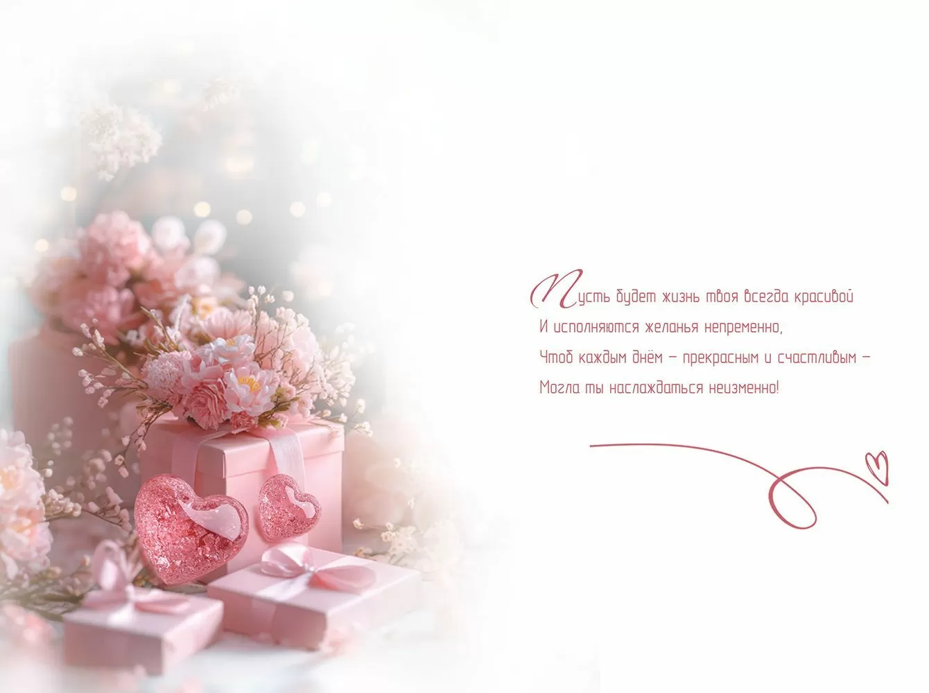 Поздравительная открытка "От меня. Love" среднего формата – идеальное решение для подарка или дополнения к подарку! Иллюстрация с нежными розовыми цветами, сердечками и коробками-подарками привлекает внимание и прекрасно подходит для приятных событий. Четкое полноцветное изображение покрыто глянцевым УФ-лаком. Внутри – поздравительное стихотворение. Изделие изготовлено из прочного материала, который хорошо держит форму. Открытка не помнется при транспортировке и использовании. Сверху на картонную основу нанесено четкое полноцветное изображение. Благодаря высокому качеству печати и защитному покрытию краски не выцветут, и открытка на праздник будет радовать адресата многие годы. Размеры – 122х182. В упаковке – 10 шт.