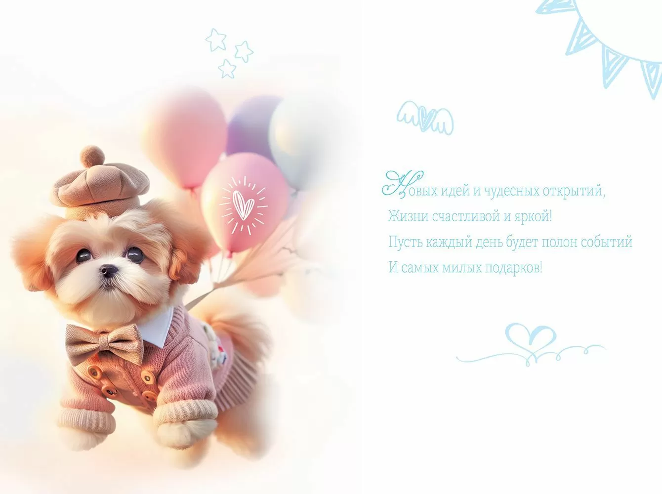 Поздравительная открытка "С днем рождения!" среднего формата – идеальное решение для подарка или дополнения к подарку! Милая, нежная иллюстрация с чудесной собачкой, летящей на воздушных шарах, привлекает внимание и прекрасно подходит для приятных событий. Четкое полноцветное изображение покрыто глянцевым УФ-лаком. Внутри – поздравительное стихотворение. Изделие изготовлено из прочного материала, который хорошо держит форму. Открытка не помнется при транспортировке и использовании. Сверху на картонную основу нанесено четкое полноцветное изображение. Благодаря высокому качеству печати и защитному покрытию краски не выцветут, и открытка на праздник будет радовать адресата многие годы. Размеры – 122х182. В упаковке – 10 шт.