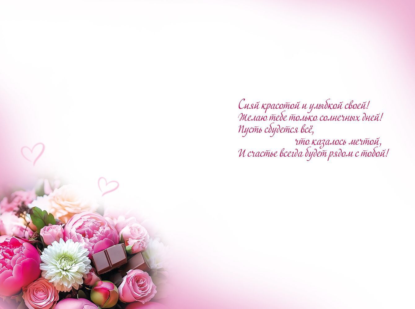 Открытка формата А5 изготовлена из плотного картона, что обеспечивает стабильную геометрию изделия и устойчивость к деформации при хранении и пересылке. Габаритные размеры готового изделия составляют 182 × 122 мм, что удобно для использования с распространёнными почтовыми конвертами и стандартными файловыми системами хранения в торговых точках и на складах. Лицевая сторона оформлена полноцветным изображением цветочной композиции с декоративными элементами и надписью «Самой красивой», что делает открытку уместной для поздравлений с днём рождения, юбилеем, 8 Марта и другими личными праздниками. Поверхность дополнительно обработана глянцевым УФ-лаком, за счёт чего изображение имеет выраженную защиту от истирания, выцветания и кратковременного воздействия влаги, сохраняя товарный вид при выкладке в местах интенсивного покупательского трафика. Внутри предусмотрен готовый печатный текст поздравления, позволяющий использовать открытку без дополнительного оформления, что сокращает время обслуживания клиентов в рознице и делает товар удобным для покупателей, выбирающих быстрое готовое решение. Картонная основа совместима с большинством шариковых и гелевых ручек, что позволяет при необходимости дописать личное обращение. Изделие поставляется в упаковке по 10 штук, что удобно для формирования полочного ассортимента, планирования закупок и оптимизации логистики. Компактный формат и ровные края способствуют рациональному размещению на стеллажах, в кассовых зонах и напольных стойках, а также упрощают транспортировку крупными партиями без риска сминания. Открытка может использоваться как самостоятельный знак внимания или как дополнение к подарку, цветам и сладостям, обеспечивая единый визуальный стиль в подарочных наборах.