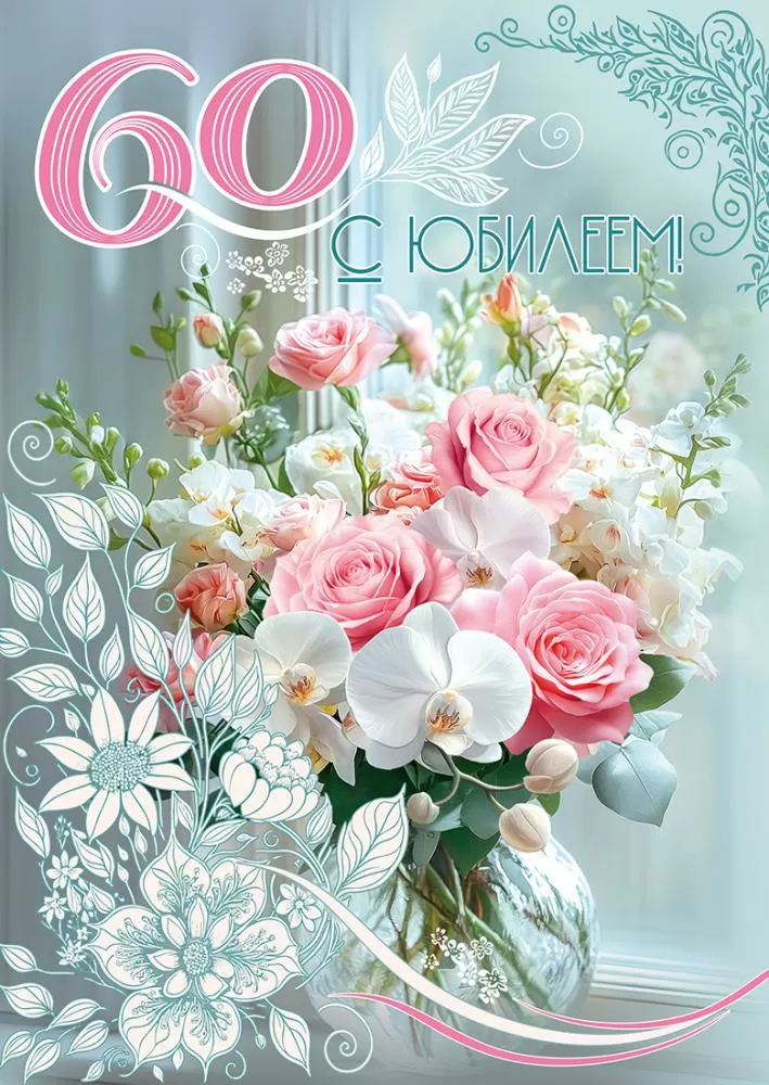 Открытка «С юбилеем! 60» в формате А5 станет прекрасным дополнением к подарку и украсит собой чудесный праздник. Волшебный дизайн в светлых оттенках порадует каждую именинницу! Украшено изделие изображением изысканного букета цветов в прозрачной вазе. Дополняют композицию изящные витиеватые узоры. Внутри открытки – замечательные стихи с теплыми пожеланиями. Такой презент можно вручить в дополнение к основному подарку, чтобы украсить поздравление и сделать его более оригинальным. Изделие выполнено из качественных материалов, что обеспечивает ему прочность и долговечность, поэтому оно станет чудесным памятным сувениром для получателя.
