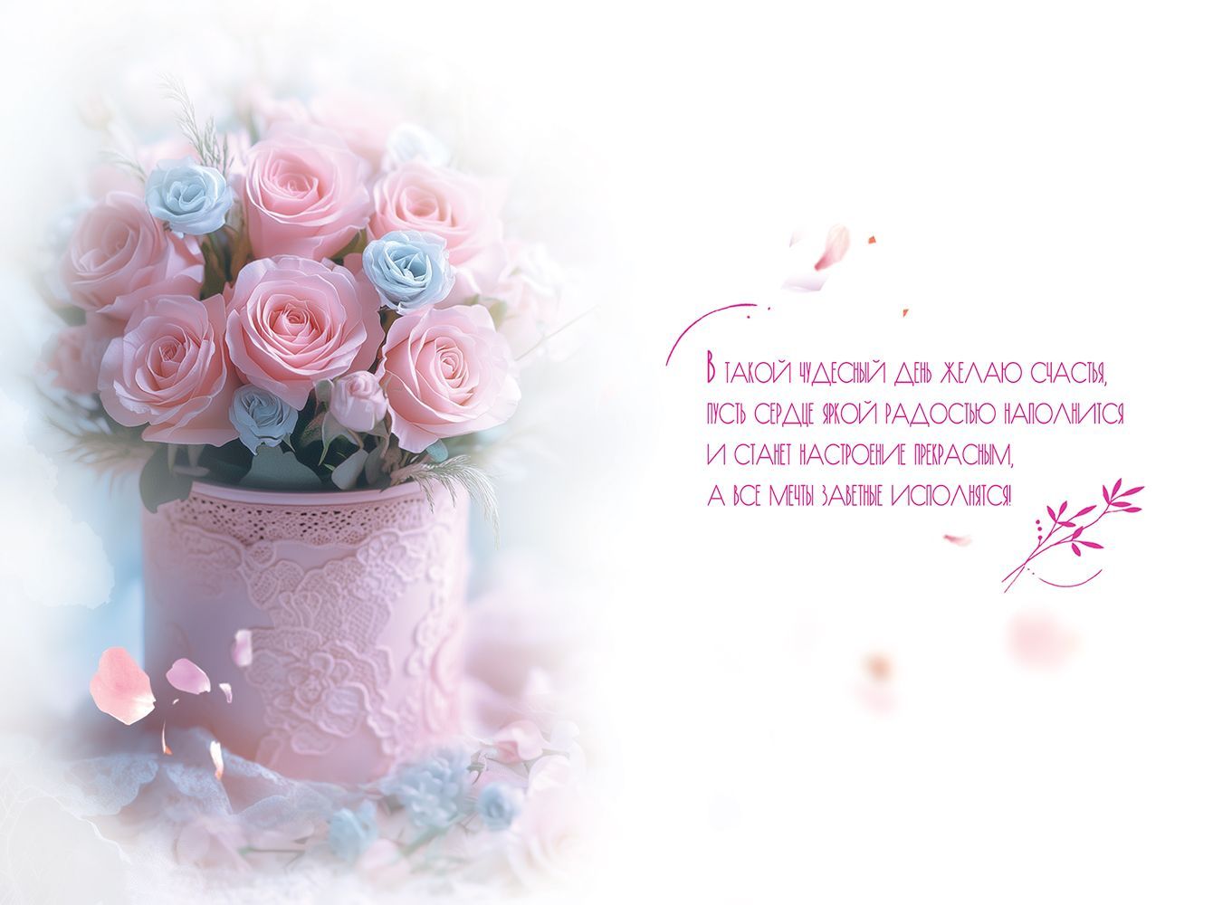 Открытка формата А5 изготовлена из плотного картона и рассчитана на интенсивное использование в розничных сетях и оптовых поставках. Готовое изделие имеет размеры 182 × 122 мм, что обеспечивает совместимость с большинством стандартных конвертов и удобство выкладки на полке или в напольных стойках. Лицевая сторона оформлена полноцветным изображением букета из розовых и голубых роз в декоративном кашпо с кружевным орнаментом и крупной надписью «Поздравляю!». Изображение дополнено радужными блестками в лаке, создающими умеренный глянцевый эффект и повышающими износостойкость печати за счет дополнительного защитного слоя. Внутри размещен печатный поздравительный текст, что сокращает время обслуживания клиентов в рознице и упрощает выбор готового решения для поздравления. Картон удерживает форму, не деформируется при стандартных условиях хранения и транспортировки, устойчив к многократному перелистыванию, что важно при открытой выкладке и демонстрации покупателям. Универсальный цветочно-праздничный сюжет и нейтральная текстовая часть позволяют использовать открытку для широкого круга поводов: дни рождения, семейные торжества, профессиональные праздники, поздравления коллег и партнеров. Изделие поставляется по 10 штук, что удобно для планирования ассортимента, формирования витринных линеек и комплектования партий под разные форматы торговых точек. Открытка подходит для единичных покупок и для формирования тематических наборов, хорошо сочетается с подарочной упаковкой пастельных тонов и может использоваться как самостоятельный элемент оформления подарка.