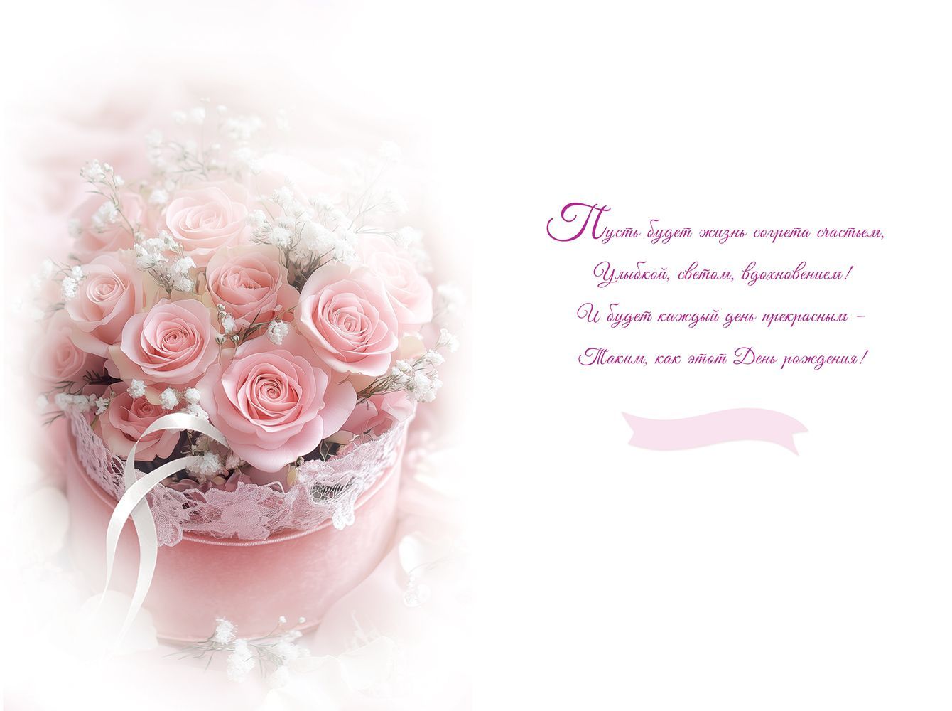 Открытка формата А5 предназначена для оформления поздравлений с днём рождения и ориентирована на использование в розничной продаже и оптовых поставках для магазинов подарков, книжных сетей и торговых точек с сопутствующей праздничной продукцией. Изделие изготовлено из плотного картона, что обеспечивает достаточную жёсткость, устойчивость к изгибам при транспортировке и хранении, а также аккуратный внешний вид при выкладке в торговом зале. Лицевая сторона оформлена изображением композиции из розовых роз в коробке с кружевной отделкой на розовом текстильном фоне и надписью «С Днём Рождения!», дополненной радужными блёстками в лаке, создающими мерцающий эффект при искусственном и дневном освещении. Такая отделка устойчива к истиранию при стандартной эксплуатации, не осыпается и не требует дополнительных мер защиты при перевозке. Внутри открытки размещён готовый поздравительный текст, что упрощает выбор для конечного покупателя и позволяет использовать изделие без дополнительных затрат времени на оформление поздравления. Габаритные размеры готового изделия составляют 182 × 122 мм, что соответствует распространённым форматам почтовых конвертов и позволяет оптимизировать хранение на складе, в витринных стойках и лотках. Открытка поставляется упаковками по 10 штук, что удобно для формирования планируемого товарного запаса, учёта остатков и организации выкладки по принципу единого дизайна. За счёт универсальной тематики оформления изделие подходит для поздравления женщин разных возрастов, может использоваться как самостоятельный элемент подарка или в комплекте с цветами, сладостями и сувенирной продукцией. Картонная основа хорошо держит форму при размещении на полке или в напольных и настольных дисплеях, что важно при формировании ассортимента и визуального ряда в торговой точке.