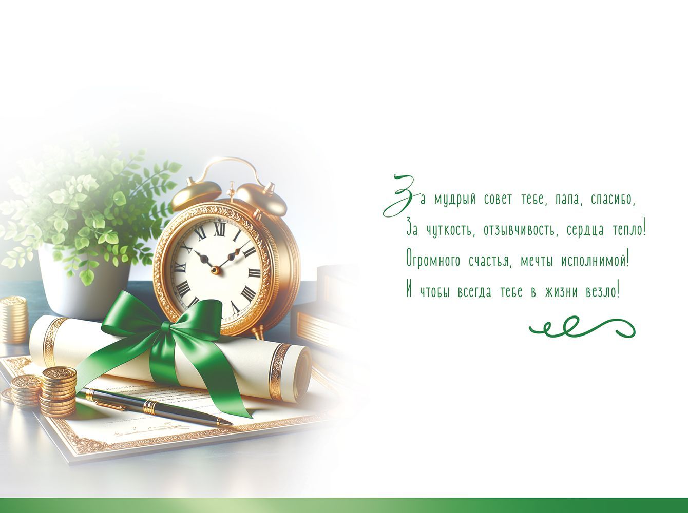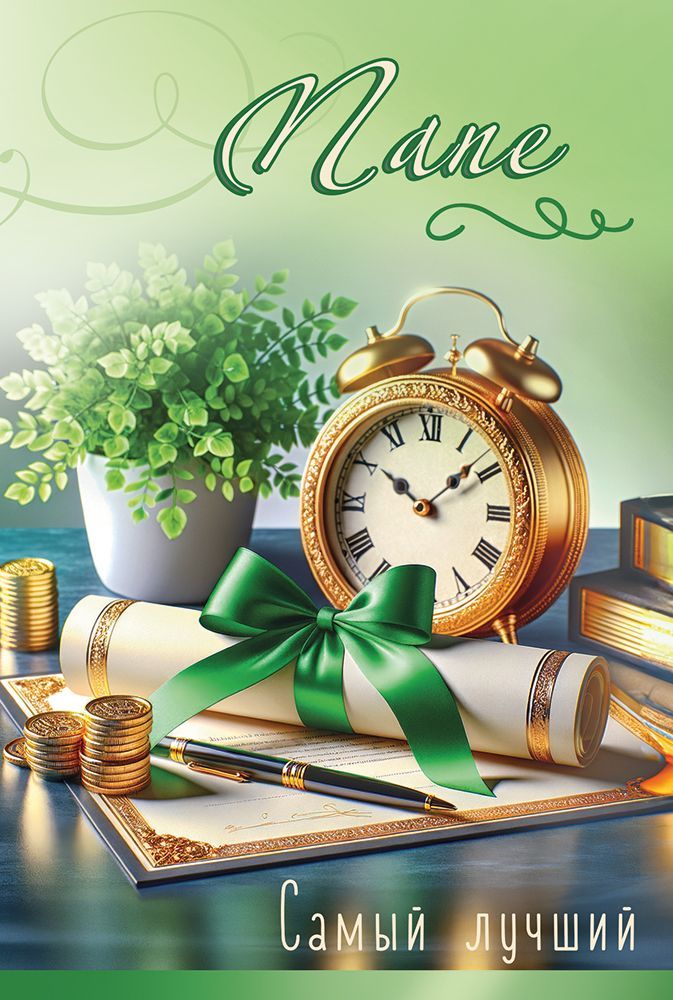 Открытка формата А5 предназначена для поздравления папы и может использоваться как самостоятельный носитель поздравительного текста или как дополнение к основному подарку. Изделие выполнено из плотного картона, что обеспечивает стабильную форму, устойчивость к изгибам и износу при транспортировке и выкладке в торговом зале. Лицевая сторона оформлена полноцветной печатью с изображением классического будильника, свитка с зелёной лентой, письменных принадлежностей и монет на фоне офисного стола, что делает открытку уместной для поздравлений с днём рождения, профессиональными и семейными праздниками, а также юбилейными датами. Дополнительный визуальный эффект создают радужные блестки в лаке, которые подчёркивают отдельные элементы дизайна и остаются устойчивыми к осыпанию при стандартной эксплуатации. На лицевой стороне размещена надпись «Папе» и «Самый лучший», внутри предусмотрен готовый поздравительный текст, что сокращает время подготовки к вручению и удобно для розничного покупателя. Длина готового изделия составляет 182 мм, ширина 122 мм, формат соответствует стандартным почтовым конвертам и витринным карманам, что упрощает хранение, сортировку и отправку. В упаковке 10 одинаковых открыток, что оптимально для оптовых заказчиков, формирующих ассортимент к календарным праздникам и тематическим акциям: тираж удобно распределять по торговым точкам, использовать в наборных предложениях или в корпоративных поздравительных программах. Плотный картон и компактные размеры обеспечивают удобство штабелирования, минимизируют риск деформации при перевозке и позволяют поддерживать аккуратный внешний вид товара на полке в течение всего сезона продаж.