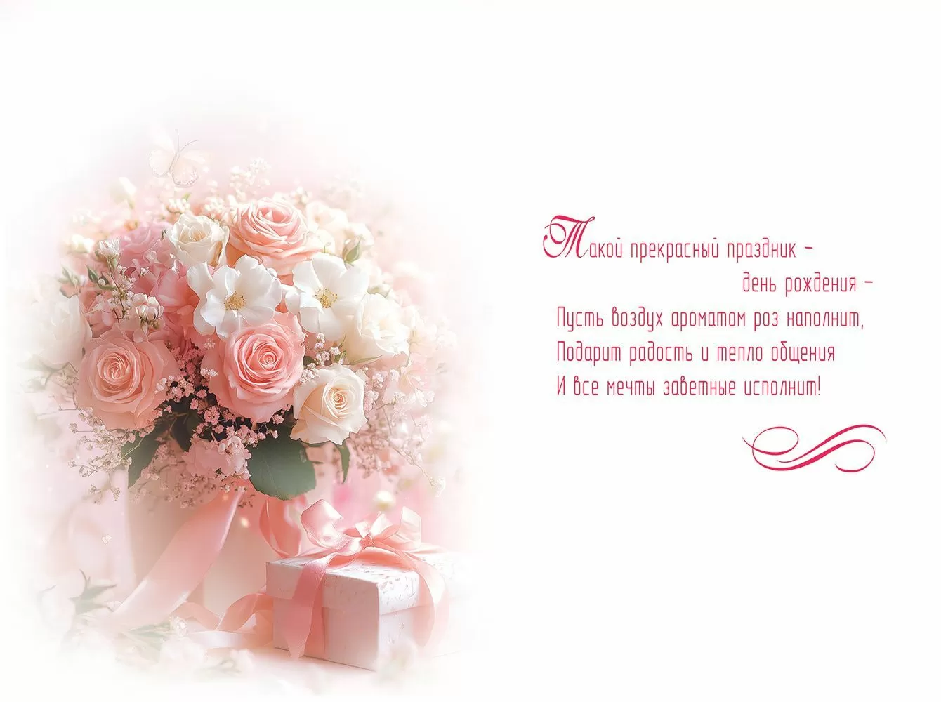 Открытка «С Днём Рождения!» в формате А5 станет прекрасным дополнением к подарку и преобразит торжество. Романтичный дизайн сделает поздравление незабываемым. Изделие украшено роскошным букетом цветов в розовых и белых оттенках. Внутри открытки находятся замечательные стихи с теплыми пожеланиями. Такой презент можно вручить в дополнение к основному подарку, чтобы украсить поздравление и сделать его более оригинальным. Изделие выполнено из качественных материалов, что обеспечивает ему прочность и долговечность, поэтому оно станет чудесным памятным сувениром для получателя.