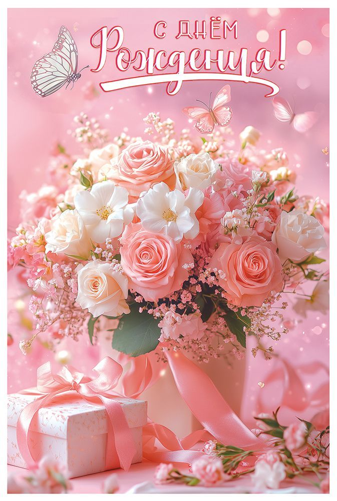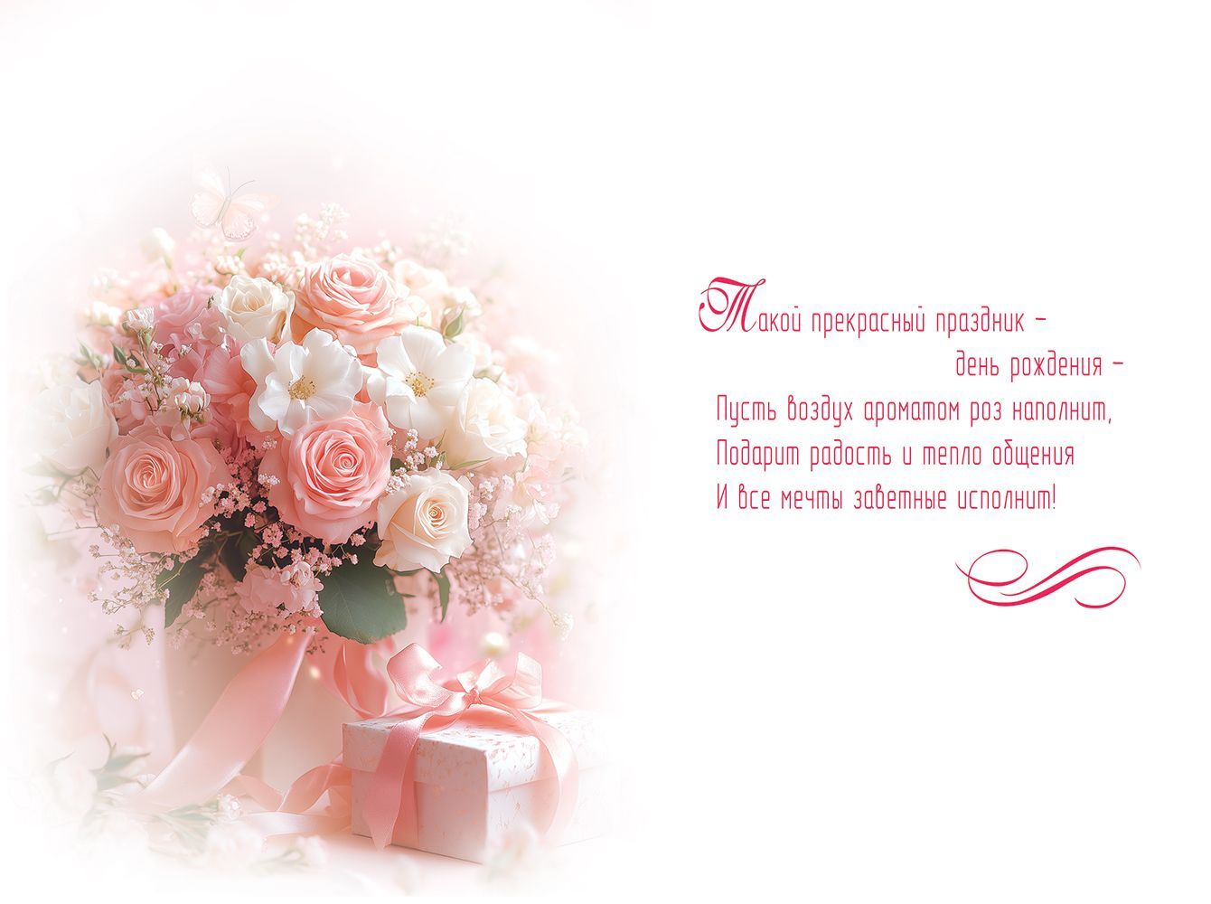 Открытка формата А5 предназначена для оформления поздравлений с днём рождения и ориентирована на использование в розничной продаже и оптовых поставках. Изделие изготовлено из плотного картона, обеспечивающего устойчивость к деформации при транспортировке и хранении, что важно при формировании больших партий и выкладке в торговом зале. Лицевая сторона оформлена изображением букета из роз и декоративных цветов на розовом фоне с подарочной коробкой и надписью «С Днём Рождения!», что делает открытку универсальной для поздравления женщин и девушек в личных и корпоративных ситуациях. Внутри предусмотрен готовый поздравительный текст, позволяющий сократить время на оформление послания и обеспечить единый стиль поздравлений при массовой раздаче. Поверхность дополнительно декорирована блёстками в лаке радужного эффекта, благодаря чему изображение сохраняет чёткую полиграфию и получает выразительные световые акценты без осыпания покрытия при стандартной эксплуатации. Габариты готового изделия составляют 182 × 122 мм, что соответствует распространённым размерам конвертов и облегчает подбор сопутствующей упаковки, а также размещение открытки в витринных и кассовых зонах. Конструкция рассчитана на многократные тактильные контакты: картон держит форму при перелистывании, не растрескивается в линии сгиба и сохраняет внешний вид в течение длительного срока хранения на складе и у конечного покупателя. В упаковке 10, что удобно для оптовых закупок, планирования ассортимента по категориям праздников и формирования равномерной выкладки по цветовым решениям. Открытка подходит для использования как самостоятельный носитель поздравления или как дополнение к подарку, гармонично сочетается с подарочными пакетами и коробками в розово-белой гамме и может применяться в розничных магазинах, цветочных салонах, сувенирных и канцелярских отделах.