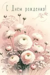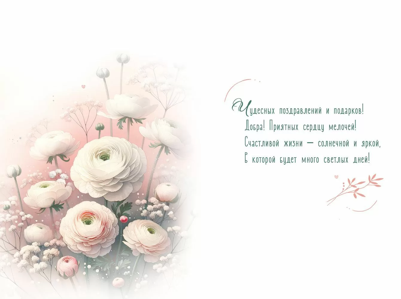Открытка «С Днём Рождения!» в формате А5 станет прекрасным дополнением к подарку и преобразит торжество. Элегантный дизайн сделает поздравление незабываемым. На изделии изображены белоснежный цветы, которые помогут подарить вдохновение и море позитивных эмоций получательнице. Внутри открытки находятся замечательные стихи с теплыми пожеланиями. Такой презент можно вручить в дополнение к основному подарку, чтобы украсить поздравление и сделать его более оригинальным. Изделие выполнено из качественных материалов, что обеспечивает ему прочность и долговечность, поэтому оно станет чудесным памятным сувениром для получателя.