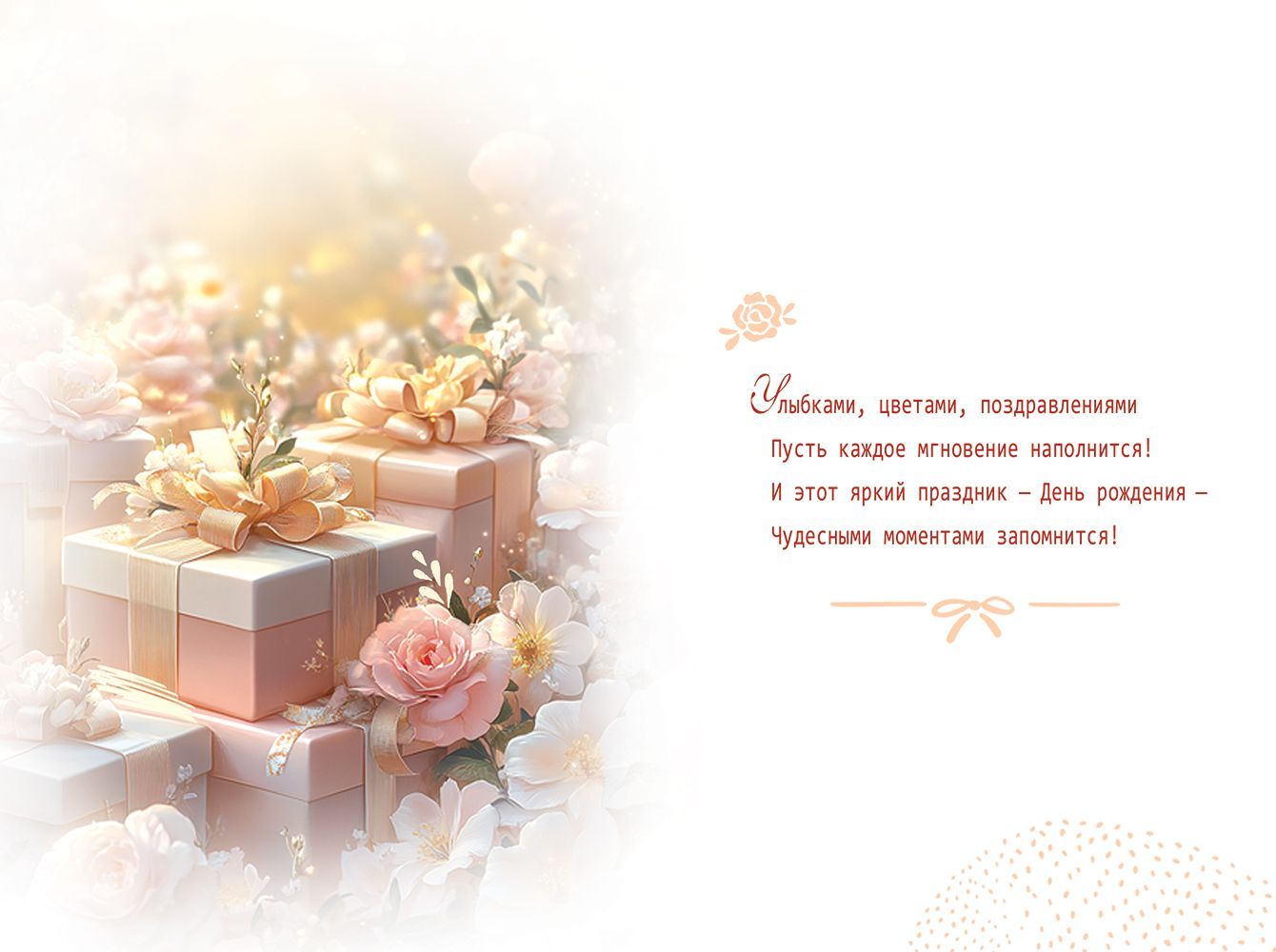 Открытка формата А5 предназначена для оформления поздравлений с днём рождения и ориентирована на использование в розничной продаже и оптовых поставках для магазинов, сетей и корпоративных клиентов. Изделие изготовлено из плотного картона, что обеспечивает стабильную геометрию, устойчивость к изгибам и износу при транспортировке и выкладке. Лицевая сторона оформлена полноцветным изображением подарочных коробок и цветочной композиции в тёплой пастельной гамме, дополненной надписью «С Днём Рождения!» и декоративной отделкой: блестки в лаке радужные создают умеренный переливающийся эффект при искусственном и дневном освещении, не осыпаются и не пачкают сопутствующую продукцию при хранении стопами. Внутри размещён готовый поздравительный текст, что удобно для массового применения в розничных точках, офисах и сервисных службах, где требуется быстрое оформление поздравления без дополнительной подготовки. Габариты готового изделия 182 × 122 мм обеспечивают совместимость с распространёнными форматами почтовых конвертов и стандартными витринными держателями, что упрощает логистику и выкладку. Открытка поставляется в упаковке по 10 штук, что удобно для формирования запаса на складе, планирования полочного пространства и пополнения ассортимента по группам праздников. Поверхность картона пригодна для письма шариковыми и гелевыми ручками без размазывания чернил, допускает индивидуальные подписи и дополнения к основному тексту. Конструкция рассчитана на многократные открытия и закрытия без растрескивания сгиба, что сохраняет товарный вид изделия в течение всего срока реализации и последующего хранения у получателя. Дизайн универсален по целевой аудитории и подходит для поздравления взрослых и подростков, в том числе в деловом и полуформальном контексте, что расширяет область применения открытки в ассортименте торговой точки или корпоративных закупок.