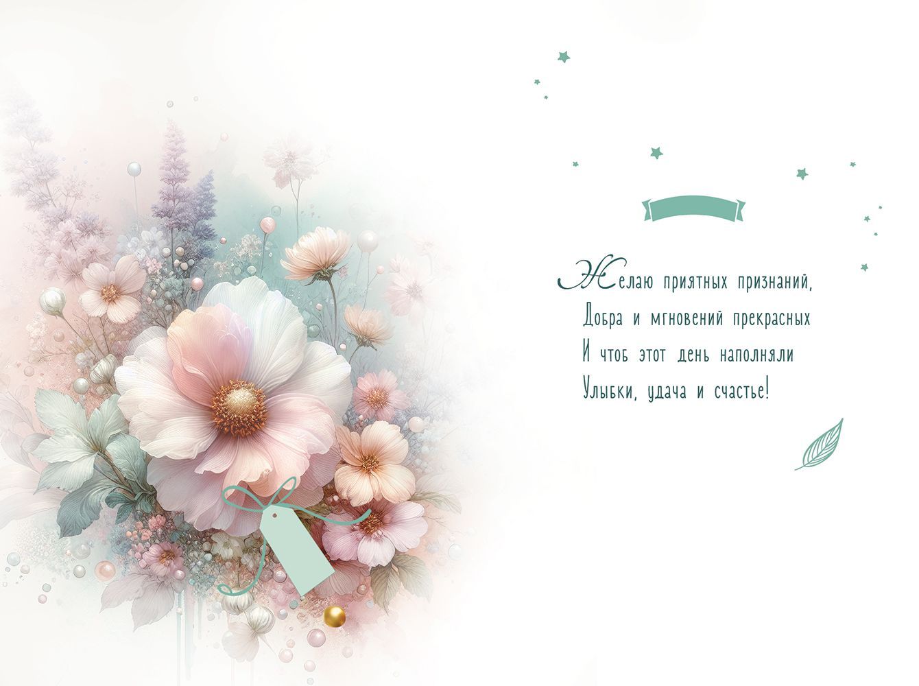 Открытка формата А5 предназначена для универсального поздравительного ассортимента и рассчитана на использование в розничной продаже и оптовых поставках. Изделие изготовлено из плотного картона, обеспечивающего стабильную геометрию и устойчивость к изгибам при хранении, транспортировке и выкладке в торговом зале. Готовый размер открытки составляет 182 × 122 мм, что удобно для стандартных конвертов и позволяет формировать единый размерный ряд на полке. Лицевая сторона оформлена цветочной композицией в мягкой пастельной гамме с крупным центральным цветком и декоративными элементами в виде бутонов, листьев и мелких акцентов; надпись «Поздравляю!» выполнена крупным шрифтом, дополнительно выделяющим назначение изделия. В оформлении применены блестки в лаке радужные, создающие умеренный переливающийся эффект и повышающие износостойкость печати за счет защитного лаковго слоя. Внутри открытки предусмотрен напечатанный текст с нейтральными пожеланиями, что упрощает использование в качестве готового решения без необходимости составления индивидуального поздравления, при этом остается свободное место для личной подписи. Конструкция изделия плоскостная, без дополнительных элементов, что снижает риск повреждений при массовой транспортировке и позволяет компактно размещать открытки в стандартных лотках, дисплеях и напольных стойках. Тираж в упаковке — 10, что удобно для формирования заказов по позициям ассортимента, инвентаризации и планирования выкладки по категориям праздников и событий. Открытка может использоваться для поздравления с днем рождения, семейными и календарными праздниками, а также как дополнение к подарку или цветочной композиции, сохраняя аккуратный внешний вид при кратковременном и длительном хранении.