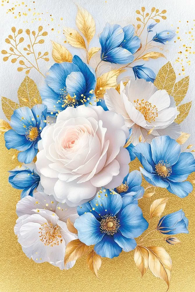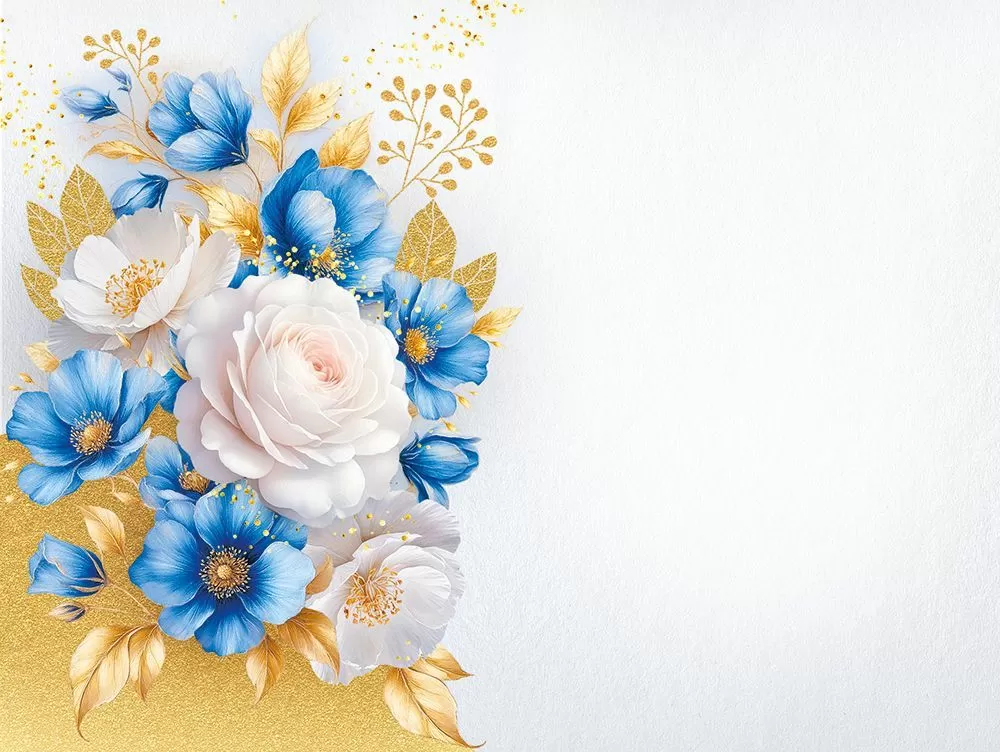 Открытка без надписи в формате А5 станет прекрасным дополнением к подарку и украсит любое поздравление. Классический дизайн подойдет всем! Изображения изящных белых и синих цветов, дополненных золотыми листьями, составляют яркую композицию, украшенную отделкой золотыми блестками. Открытка универсальная, подходит для вручения по любому случаю. Внутри нее есть место для того, чтобы оставить собственные пожелания и подпись. Такой презент можно вручить в дополнение к основному подарку, чтобы украсить поздравление и сделать его более оригинальным. Изделие выполнено из качественных материалов, что обеспечивает ему прочность и долговечность, поэтому оно станет чудесным памятным сувениром для получателя.