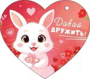 Небольшая открытка «Давай дружить!» в форме сердца – это милое и стильное дополнение к любому подарку. Насыщенный красный цвет и чудесный белый кролик с кучей сердечек в мягких лапках – самый лучший вариант для поздравления с Днем Святого Валентина. Такой дизайн растопит любое сердце и обязательно порадует вашего получателя. Внутри открытки также расположен текст с приятными пожеланиями. Изделие выполнено из качественных материалов, что обеспечивает ему прочность и долговечность. Его можно вложить в коробку с подарком или вручить отдельно.