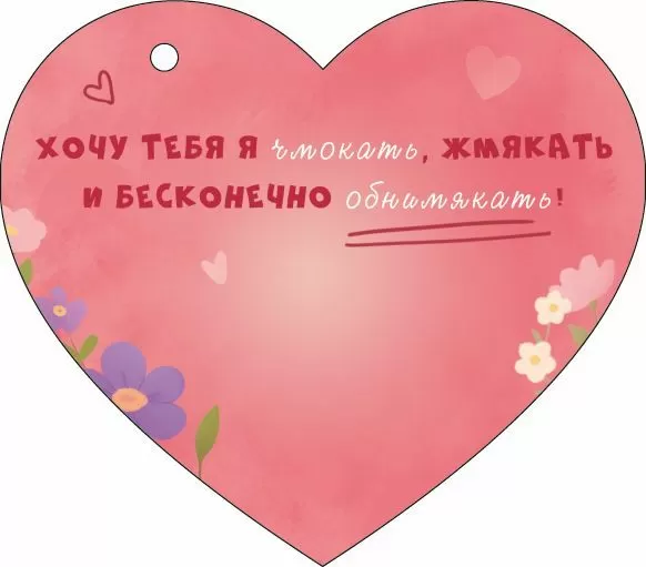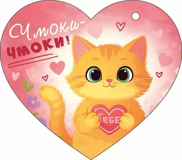 Небольшая открытка «Чмоки-чмоки!» в форме сердца – это милое и стильное дополнение к любому подарку. Мягкие оттенки красного и рыжий пушистый котенок с сердечком в руках – самый лучший вариант для поздравления с Днем Святого Валентина. Такой дизайн растопит любое сердце и обязательно порадует вашего получателя. Внутри открытки также расположен текст с приятными пожеланиями. Изделие выполнено из качественных материалов, что обеспечивает ему прочность и долговечность. Его можно вложить в коробку с подарком или вручить отдельно.