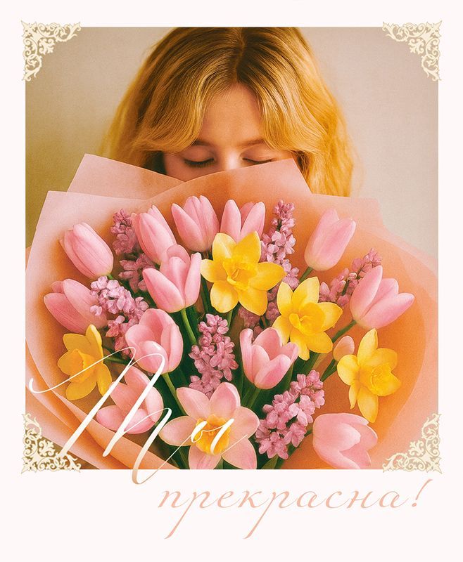 Открытка формата А6 с фигурной вырубкой выполнена из плотного картона, что обеспечивает стабильную геометрию изделия и устойчивость к механическим воздействиям при транспортировке и выкладке. Готовый размер 107 × 88 мм удобен для размещения в стандартных конвертах и витринных дисплеях, а также для хранения в коробах и кассетах при оптовой поставке. Лицевая сторона оформлена полноцветным изображением букета розовых тюльпанов и жёлтых нарциссов в нежном обрамлении, в верхней части композиции изображена девушка, что визуально подчёркивает тематическую направленность открытки как поздравительной, ориентированной на женщин. На лицевой стороне присутствует декоративная надпись, что позволяет использовать изделие как готовое решение для поздравления без дополнительного оформления. Внутри открытка не содержит текста, что даёт возможность розничному покупателю самостоятельно прописать индивидуальное пожелание, а оптовому клиенту — использовать единый артикул для широкого спектра поводов: дни рождения, 8 Марта, личные и профессиональные юбилеи, поздравления коллег и партнёров. Картонная основа хорошо держит сгиб, не растрескивается при аккуратном открывании и закрывании, пригодна для письма шариковыми и гелевыми ручками, маркерами и тонкими фломастерами. Изделие поставляется по 20 штук, что удобно для формирования ассортимента в магазинах подарков, книжных и канцелярских отделах, а также для закупок в корпоративный фонд поздравительной продукции. Компактный формат и ровные края способствуют рациональному использованию складского пространства и упрощают упаковку в стандартные транспортные короба. Открытка может использоваться как самостоятельный сувенир или как дополнение к цветам и подарочным наборам, обеспечивая единый визуальный стиль оформления поздравления.