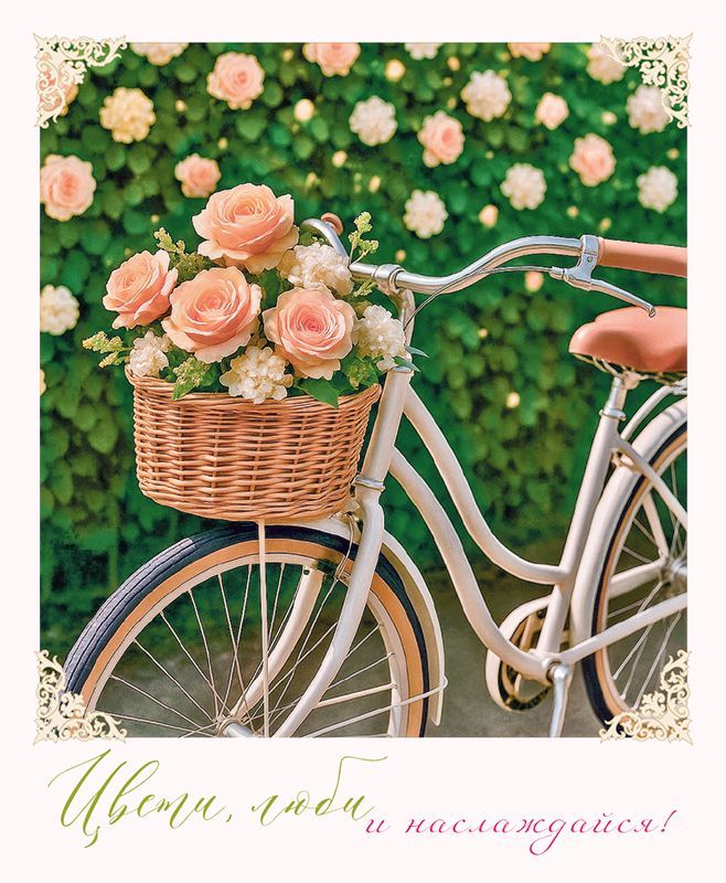 Открытка формата А6 с фигурной вырубкой изготовлена из плотного картона, обеспечивающего стабильную геометрию изделия и сохранение формы при длительном хранении и транспортировке в оптовых партиях. Готовое изделие имеет размеры 107 × 88 мм, что удобно для выкладки на стандартных полочных и прикассовых стеллажах, а также для размещения в компактных витринных дисплеях. Лицевая сторона оформлена полноцветным изображением велосипеда с плетёной корзиной, наполненной цветами, на фоне зелёной стены с розами; композиция дополнена декоративными угловыми элементами и надписью «Цвети, люби и наслаждайся!». Такая визуальная подача делает открытку универсальной для поздравлений с днём рождения, личными праздниками, романтическими событиями, а также как нейтральное пожелание доброго дня или поддержки. Внутри открытка без текста, что позволяет использовать единый артикул в широком ассортименте и адаптировать содержание под любую аудиторию, от частных лиц до корпоративных клиентов, нанося индивидуальные поздравления вручную или с помощью печати. Картонная основа рассчитана на стандартные шариковые, гелевые и капиллярные ручки без риска сильного просвечивания, что удобно при заполнении в розничных условиях. Поверхность устойчиво переносит аккуратное сгибание и кратковременное механическое воздействие, что важно при пересылке в конвертах и при многократных перекладках на складе. Количество в упаковке 20 обеспечивает удобный учёт и планирование закупок для магазинов подарков, книжных сетей и интернет-площадок, позволяя формировать равномерный ассортимент поздравительной продукции в сезон и вне сезонных пиков.