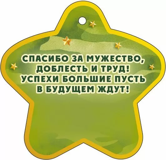 Небольшая открытка «23 Февраля» в форме пятиконечной звездочки – это стильное украшение и патриотичный подарок. Яркие оттенки, крупная поздравительная надпись и золотые звездочки составляют оригинальную композицию, идеально подходящую для поздравления с Днем защитника Отечества. Дизайн для настоящих героев! Внутри открытки также расположен текст с приятными пожеланиями. Изделие выполнено из качественных материалов, что обеспечивает ему прочность и долговечность. Его можно вложить в коробку с подарком или вручить отдельно.