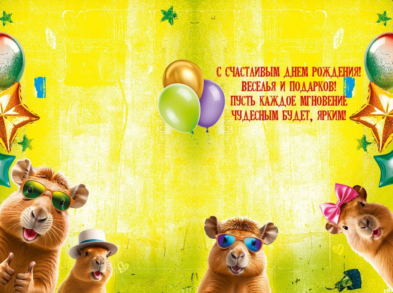 Открытка «С Днем Рождения!» в формате А5 станет прекрасным дополнением к подарку и украсит праздник. Изделие украшено сочными яркими цветами, изображениями воздушных праздничных шаров и мордочками забавных капибар. Такой дизайн понравится всем! Внутри открытки – замечательные стихи с теплыми пожеланиями. Такой презент можно вручить в дополнение к основному подарку, чтобы украсить поздравление и сделать его более оригинальным. Изделие выполнено из качественных материалов, что обеспечивает ему прочность и долговечность, поэтому оно станет чудесным памятным сувениром для получателя.