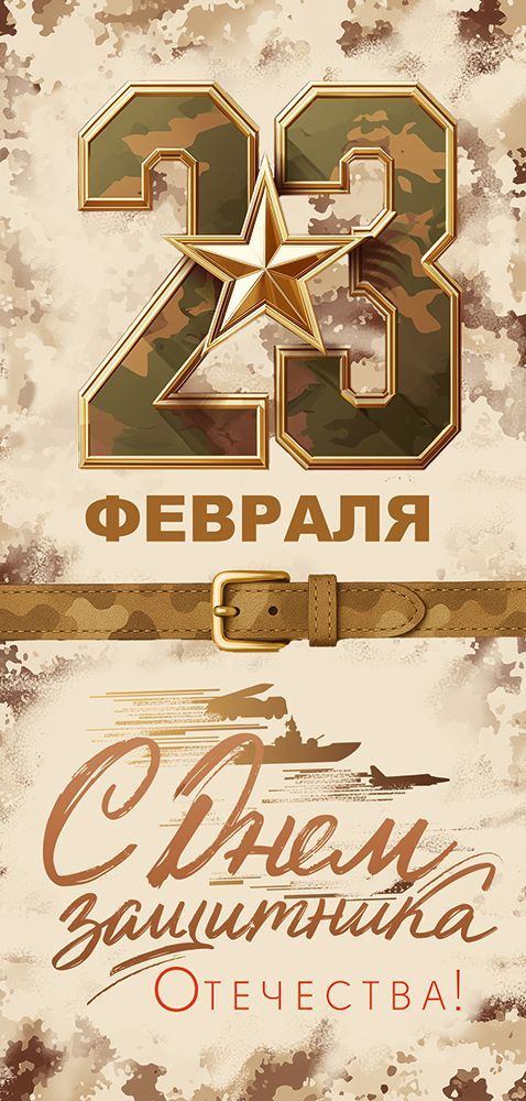 Открытка формата евро выполнена из плотного картона и предназначена для оформления поздравлений к 23 Февраля. Лицевая сторона оформлена в тематике Дня защитника Отечества: крупное числовое обозначение «23» в камуфляжной стилистике с золотистым контуром и звездой по центру, надпись «Февраля», декоративный пояс с пряжкой и поздравительный текст «С Днём защитника Отечества!». Фоновый рисунок выдержан в нейтральной бежево‑коричневой гамме с имитацией камуфляжного узора, что делает изделие универсальным для мужской аудитории разного возраста и статуса. Внутренняя часть без текста, что удобно при оптовых закупках для корпоративного сегмента: открытка подходит под единый фирменный стиль, позволяет самостоятельно наносить индивидуальные поздравления, логотипы, подписи руководства или использовать стандартные вкладыши. Картон обеспечивает стабильную геометрию и сохранность формы при транспортировке и хранении, открытка не деформируется в стандартных почтовых конвертах и коробах, устойчива к многократным перекладываниям при выкладке в рознице. Готовое изделие имеет длину 204 мм и ширину 97 мм, что соответствует распространённым евро‑конвертам и облегчает планирование логистики и полочного пространства. Нейтральная, но узнаваемая праздничная графика позволяет включать товар в широкий ассортимент сезонных предложений для магазинов, офисов и предприятий, а также использовать в качестве дополнения к подарочным наборам, сувенирной продукции и корпоративным презентам. В упаковке 10 штук, что удобно для формирования мелкооптовых партий, равномерной выкладки по торговым точкам и расчёта потребности на период праздничного спроса, при этом для розничного покупателя такой объём может быть использован для поздравления коллектива, подразделения или группы сотрудников.