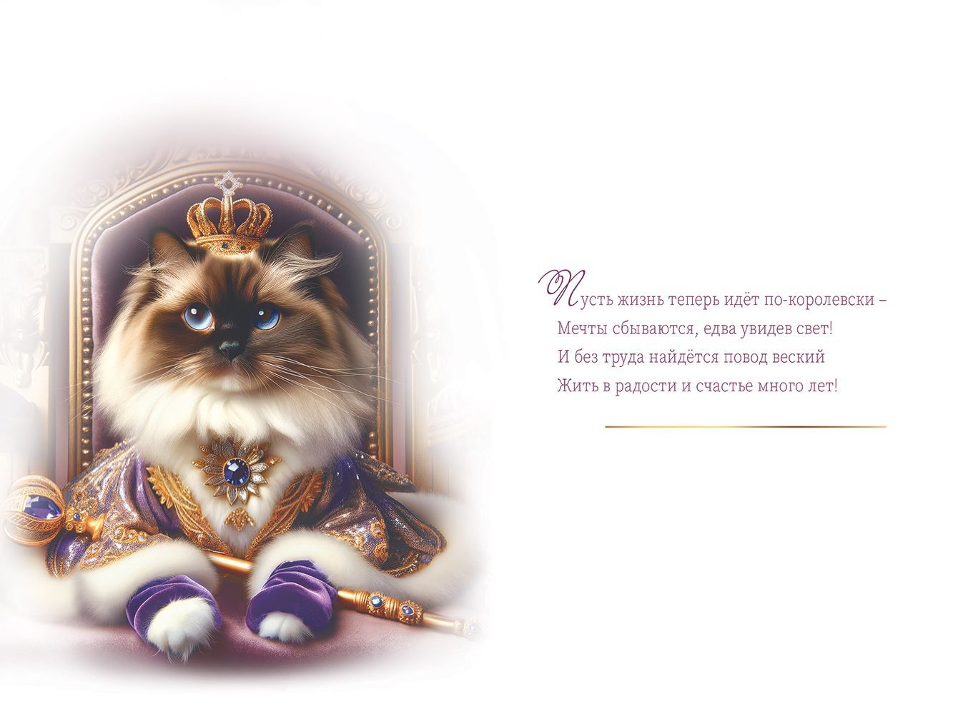 Открытка формата А5 предназначена для поздравления с юбилеем и ориентирована на использование в розничной продаже и оптовых поставках для магазинов подарочной и канцелярской продукции. Изделие изготовлено из плотного картона, что обеспечивает стабильную геометрию при хранении и транспортировке, устойчивость к изгибам и разрывам, а также аккуратный внешний вид при выкладке на полке или в напольных/настольных стойках. Лицевая сторона оформлена полноцветным изображением кота в королевском убранстве на троне на фоне декоративных элементов, с крупной надписью «С ЮБИЛЕЕМ!». В отделке применены золотые блестки в лаке, создающие локальные акценты и подчёркивающие праздничный характер изделия; покрытие устойчиво к осыпанию при стандартной эксплуатации и не требует дополнительной защиты при розничной выкладке. Внутри открытки размещён поздравительный текст, что удобно для покупателей, предпочитающих готовое решение без необходимости подбора формулировок. Длина готового изделия 182 мм, ширина 122 мм, размеры подобраны для совместимости с типовыми почтовыми конвертами соответствующего формата и стандартными витринными карманами. Плотный картон позволяет использовать открытку как самостоятельный элемент оформления подарка, цветочной композиции или праздничной зоны, сохраняя форму при вертикальной установке на подставку. В упаковке 10, что удобно для планирования оптовых закупок, формирования ассортимента по тематикам юбилеев и оптимизации места на складе: упаковка компактна, не требует специальных условий хранения и выдерживает многократные циклы перемещения. Открытка подходит для поздравления взрослых получателей с разным статусом и сферой деятельности, сочетая нейтральный юмористичный визуальный образ с официальной праздничной тематикой, за счёт чего может использоваться как универсальная позиция в ассортиментной матрице.