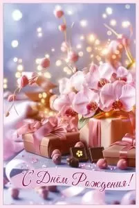 Поздравительная открытка "С днем рождения!" среднего формата – идеальное решение для подарка или дополнения к подарку! Размеры – 122х182. Внутри – поздравительное стихотворение. Украшенная золотыми блестками в лаке, открытка выглядит очаровательно и привлекает внимание. На открытке изображены чудесные цветущие орхидеи, коробки-подарки и шоколад. Изделие изготовлено из прочного материала, который хорошо держит форму и не помнется при транспортировке и использовании. Сверху на картонную основу нанесено четкое полноцветное изображение. Благодаря высокому качеству печати и защитному покрытию краски не выцветут, и открытка на праздник будет радовать адресата многие годы. В упаковке – 10 шт.