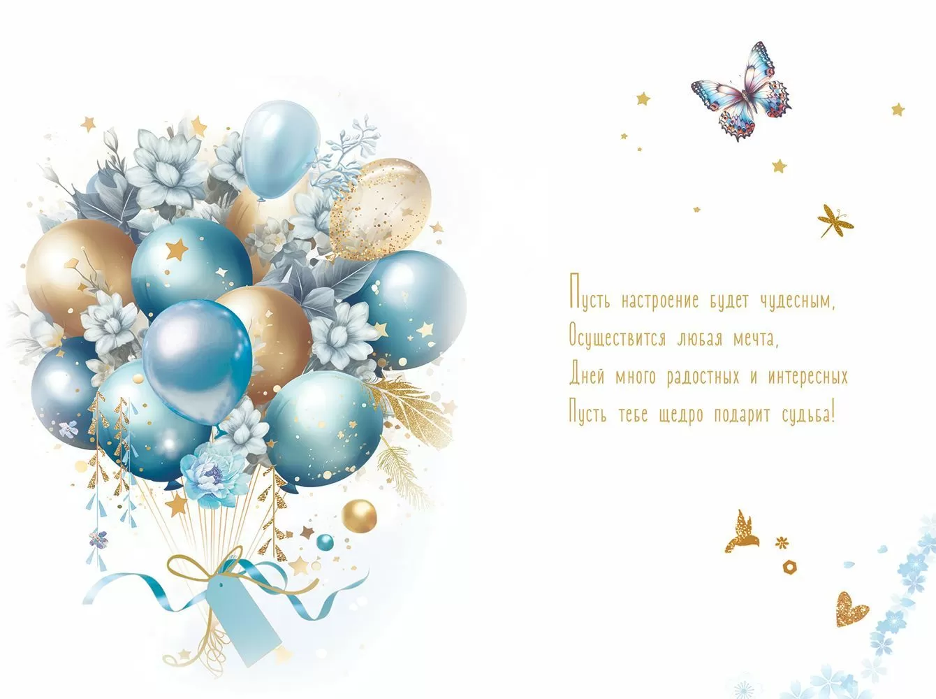 Поздравительная открытка "С днем рождения! Тебе" среднего формата – идеальное решение для подарка или дополнения к подарку! Размеры – 122х182. Внутри – поздравительное стихотворение. Украшенная золотыми блестками в лаке, открытка выглядит очаровательно и привлекает внимание. На открытке изображены голубые и золотые воздушные шары и цветы. Изделие изготовлено из прочного материала, который хорошо держит форму и не помнется при транспортировке и использовании. Сверху на картонную основу нанесено четкое полноцветное изображение. Благодаря высокому качеству печати и защитному покрытию краски не выцветут, и открытка на праздник будет радовать адресата многие годы. В упаковке – 10 шт.