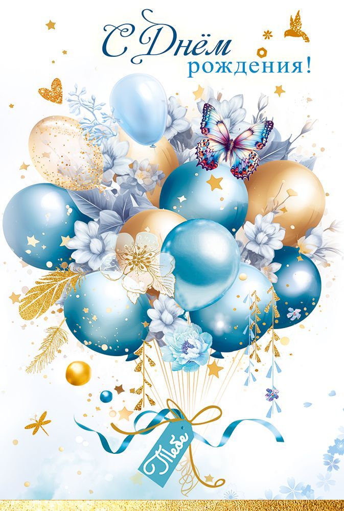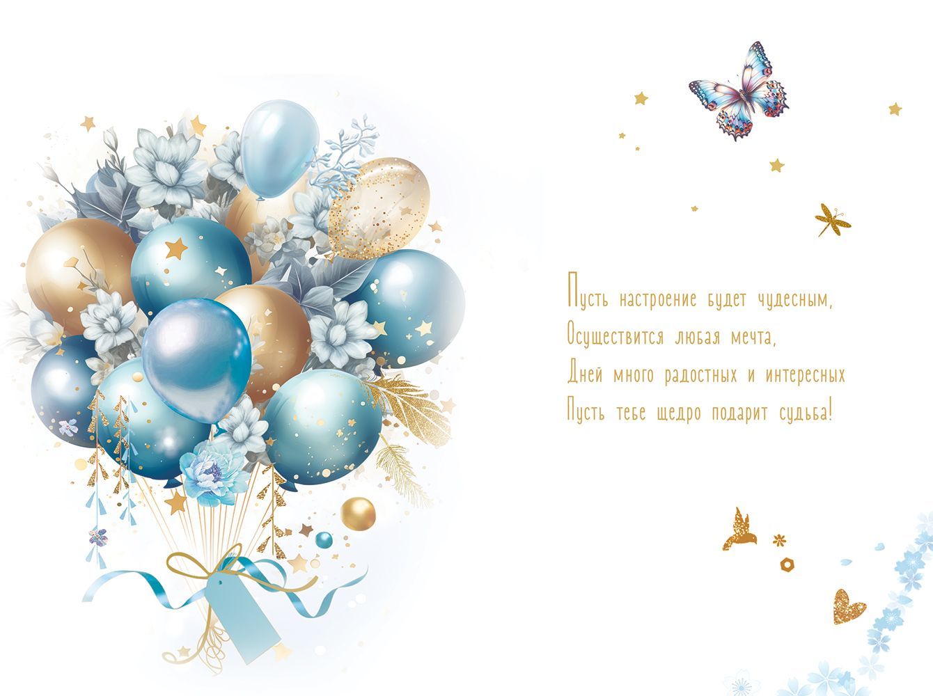 Открытка формата А5 предназначена для поздравления с днём рождения и ориентирована на использование в розничной продаже и оптовых поставках для магазинов подарочной продукции, книжных сетей и корпоративных клиентов. Основа изделия выполнена из плотного картона, обеспечивающего стабильную геометрию, устойчивость к изгибам и сохранение первоначального вида при хранении, транспортировке и выкладке в торговом зале. Готовое изделие имеет длину 182 мм и ширину 122 мм, что соответствует стандартным размерам для размещения в конвертах и на типовых витринах. Лицевая сторона оформлена полноцветной печатью с изображением композиции из воздушных шаров, цветов и декоративных элементов в голубой, золотистой и белой гамме, с акцентом на надпись «С Днём рождения!» и тег «Тебе». Дополнительно применена отделка блестками в лаке золотого цвета, за счёт чего отдельные фрагменты рисунка имеют лёгкий рельеф и выраженный световой акцент; покрытие фиксируется на поверхности и не осыпается при нормальной эксплуатации, что важно при массовой выкладке и пересортице. Внутри открытки предусмотрен заранее напечатанный поздравительный текст, позволяющий использовать изделие без дополнительной подготовки, что удобно для розничных покупателей и снижает время обслуживания в торговых точках. Картонная основа совместима с шариковыми и гелевыми ручками, что даёт возможность дописать персональное обращение. Конструкция открытки рассчитана на многократное перелистывание без растрескивания сгиба, подходит для индивидуального дарения, включения в подарочные наборы и корпоративные поздравительные комплекты. В упаковке 10 изделий, что удобно для формирования оптового ассортимента, планирования полочного пространства и расчёта закупок с учётом сезонного спроса на поздравительные открытки.