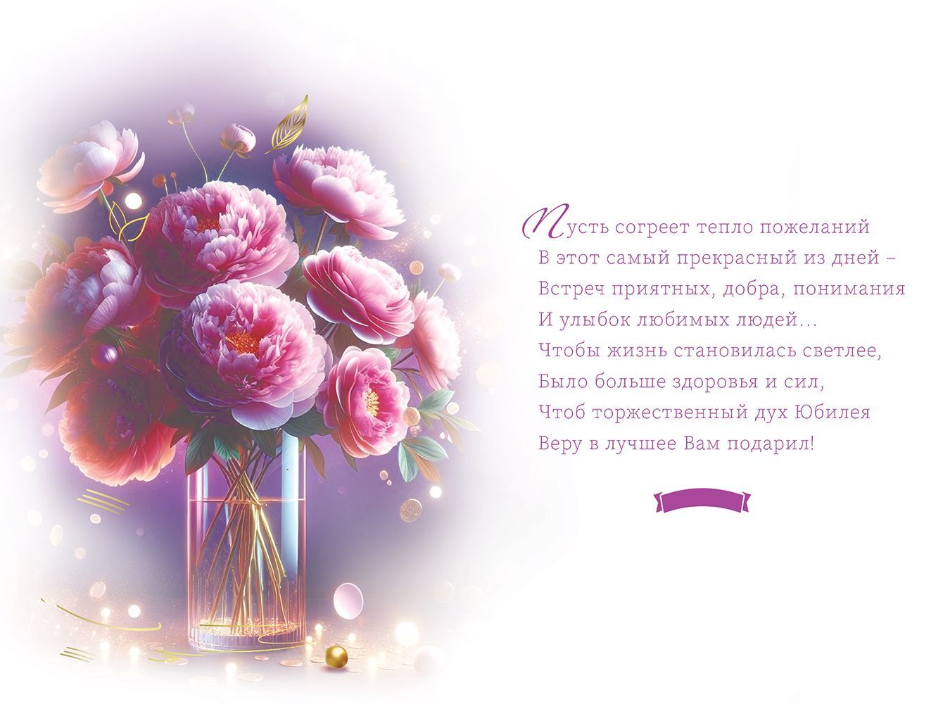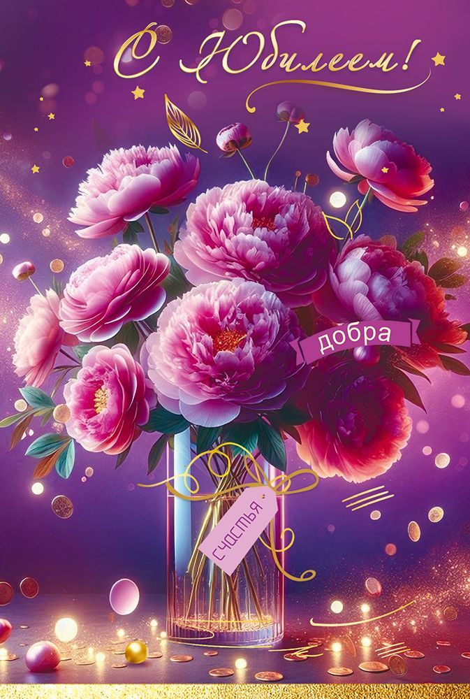 Открытка формата А5 предназначена для поздравления с юбилеем и ориентирована на использование в розничной продаже и оптовых поставках для торговых сетей, сувенирных отделов и корпоративных закупок. Изделие изготовлено из плотного картона, обеспечивающего сохранение формы при транспортировке, выкладке и хранении в стандартных стеллажных системах и напольных стойках. Лицевая сторона оформлена полноцветным изображением букета пионов в вазе на фиолетовом фоне с надписью «С Юбилеем!» и декоративными элементами, дополненными блестками в лаке золотые, что создает выраженный акцент на поздравительном характере продукции и сохраняет устойчивый внешний вид при нормальной эксплуатации. Внутри предусмотрен готовый поздравительный текст, позволяющий использовать открытку без дополнительной доработки, что удобно при массовой продаже и для розничного покупателя, выбирающего быстрое решение для оформления подарка. Габаритные размеры готового изделия: длина 182 мм, ширина 122 мм; параметры подобраны под распространённые форматы конвертов и стандартные кассовые зоны, что облегчает планирование выкладки и логистики для оптовых клиентов. Поверхность картона устойчива к незначительным механическим воздействиям, не деформируется при кратковременном изгибе, что важно при пересылке и перемещении в коробах. Дизайн универсален для поздравления женщин и мужчин старшего возраста, подходит для личных и корпоративных юбилеев, может использоваться в качестве дополнения к подарочным наборам, цветам и сувенирной продукции. В упаковке 10 штук, что удобно для формирования ассортиментной матрицы, планирования остатков и оптимизации полочного пространства в торговой точке.