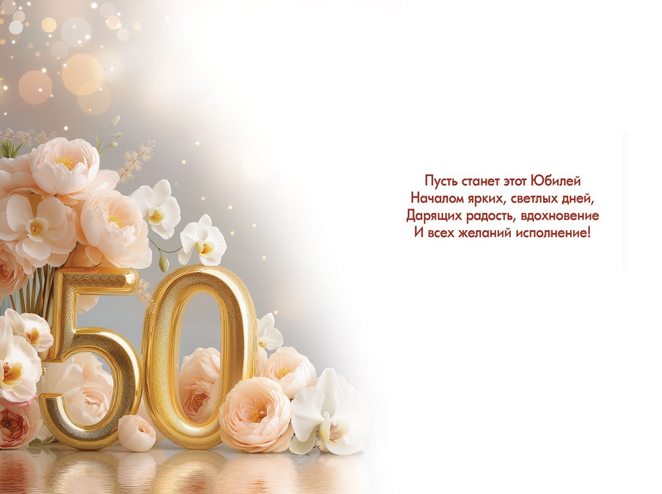 Открытка формата А5 предназначена для поздравления с 50‑летним юбилеем и рассчитана на использование в розничной продаже и оптовых поставках для торговых точек, цветочных салонов, сувенирных отделов и корпоративных закупок. Изделие изготовлено из плотного картона, обеспечивающего стабильную форму, стойкость к изгибам и удобство экспонирования на витрине или стенде. Лицевая сторона оформлена крупной золотистой цифрой «50» на мягком градиентном фоне с композициями из светлых пионов и орхидей; декоративные элементы дополнены блестками в лаке золотые, создающими аккуратный мерцающий эффект при искусственном и дневном освещении, что важно при выкладке в зале и на кассовых стойках. Внутри предусмотрен уже нанесенный поздравительный текст, что сокращает время обслуживания в рознице и делает открытку готовым решением для покупателей, выбирающих быстрое и формальное оформление поздравления. Длина готового изделия 182 мм, ширина 122 мм, размеры соответствуют стандартным почтовым и подарочным форматам, что упрощает подбор конвертов и упаковки. Плотный картон устойчив к небольшим механическим воздействиям при транспортировке оптовых партий и хранении в коробах, не деформируется при вертикальной выкладке и многократном перелистывании. Нейтральная по цветовой гамме и тематике композиция подходит для широкого круга адресатов: коллег, партнеров, клиентов, родственников и знакомых, что позволяет включать данную открытку в базовый ассортимент к юбилейным датам без необходимости дополнительной сегментации. Упаковка по 10 штук оптимальна для планирования складских остатков, формирования витринных подборок и комплектования тематических стендов к праздникам, а также удобна для розничного покупателя при покупке нескольких экземпляров для поздравления коллектива или группы гостей.