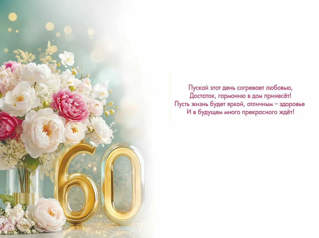 Поздравительная открытка "С юбилеем! 60" среднего формата – идеальное решение для подарка или дополнения к подарку! Размеры – 122х182. Внутри – поздравительное стихотворение. Украшенная золотыми блестками в лаке, открытка выглядит интересно и привлекает внимание. На открытке изображены нежный букет цветов и золотая цифра 50. Изделие изготовлено из прочного материала, который хорошо держит форму и не помнется при транспортировке и использовании. Сверху на картонную основу нанесено четкое полноцветное изображение. Благодаря высокому качеству печати и защитному покрытию краски не выцветут, и открытка на праздник будет радовать адресата многие годы. В упаковке – 10 шт.
