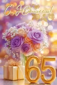 Поздравительная открытка "С юбилеем! 65" среднего формата – идеальное решение для подарка или дополнения к подарку! Размеры – 122х182. Внутри – поздравительное стихотворение. Украшенная золотыми блестками в лаке, открытка выглядит интересно и привлекает внимание. На открытке изображены нежный букет цветов и золотая цифра 50. Изделие изготовлено из прочного материала, который хорошо держит форму и не помнется при транспортировке и использовании. Сверху на картонную основу нанесено четкое полноцветное изображение. Благодаря высокому качеству печати и защитному покрытию краски не выцветут, и открытка на праздник будет радовать адресата многие годы. В упаковке – 10 шт.