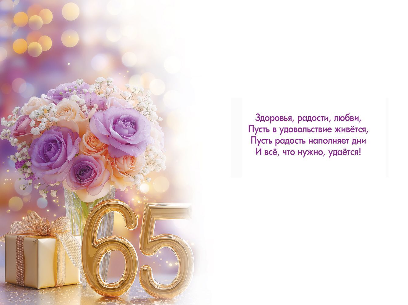 Открытка формата А5 предназначена для поздравления с юбилеем 65 лет и ориентирована на использование в розничной продаже и оптовых поставках для сетей, магазинов подарков и корпоративных закупок. Основа изделия выполнена из плотного картона, обеспечивающего стабильную геометрию, устойчивость к изгибам и сохранение формы при транспортировке и длительном хранении в складских условиях. Лицевая сторона оформлена полноцветной печатью с изображением букета роз в стеклянной вазе, подарочной коробки и крупной золотистой цифры «65», на фоне мягкого градиента с размытыми световыми бликами, что делает открытку универсальной для поздравления как женщин, так и мужчин в официальном или семейном формате. Надпись «С Юбилеем!» выполнена декоративным шрифтом с использованием золотистых элементов и дополнена блестками в лаке золотого цвета, создающими аккуратный мерцающий эффект при искусственном и дневном освещении; покрытие устойчиво к истиранию при стандартной эксплуатации и не осыпается при многократном извлечении из упаковки. Внутри расположен заранее напечатанный поздравительный текст, что удобно для корпоративных клиентов и розничных покупателей, которым требуется быстрое оформление поздравления без дополнительной подготовки. Габариты готового изделия составляют 182 мм по длине и 122 мм по ширине, что позволяет использовать открытку с большинством стандартных конвертов соответствующего формата и рационально размещать ее на полочных выкладках, в напольных и настольных дисплеях. В упаковке 10 штук, что удобно для планирования оптовых закупок, формирования ассортиментных матриц по возрастным юбилеям и оптимизации логистики. Открытка подходит для вручения лично, вложения в подарок или отправки по почте, сохраняет читаемость и внешний вид при аккуратном обращении, что делает ее функциональным и предсказуемым по качеству элементом праздничного ассортимента.