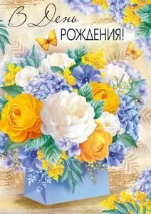 Открытка «В День рождения» в формате А4 станет прекрасным дополнением к любому подарку. Чудесный дизайн изделия сделает любое поздравление незабываемым! В центре композиции – букет восхитительных цветов, вокруг которого кружат бабочки. Внутри открытки – замечательные стихи с теплыми пожеланиями. Изделие выполнено из качественных материалов, что обеспечивает ему прочность и долговечность, поэтому оно станет чудесным памятным сувениром для получателя.