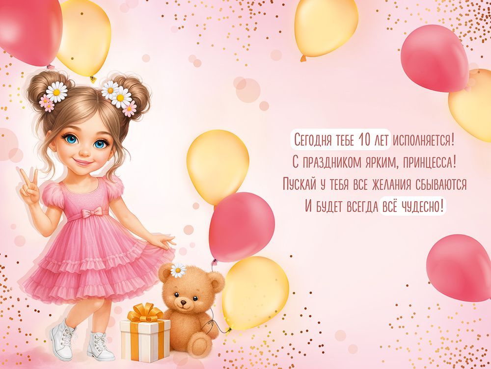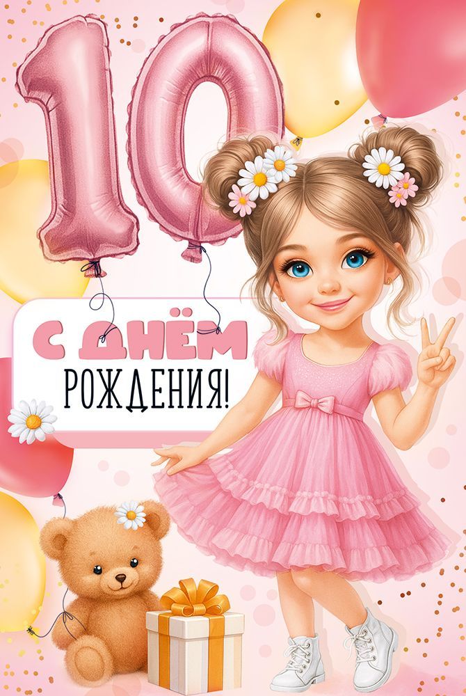 Открытка формата А5 предназначена для поздравления девочки с десятилетием и ориентирована на использование в розничной продаже и оптовых поставках для магазинов подарков, канцелярии и сетевой розницы. Основа изделия выполнена из плотного картона, обеспечивающего стабильную форму, устойчивость к изгибам и сохранность внешнего вида при транспортировке и хранении в стандартных стеллажных и кассетных выкладках. Габариты готового изделия составляют 182 × 122 мм, что соответствует распространённым форматам конвертов и позволяет легко интегрировать открытку в существующий ассортимент. Лицевая сторона оформлена полноцветной печатью с изображением девочки в розовом платье, воздушных шаров с крупной цифрой «10», подарка и плюшевого медведя; композиция дополнена надписью «С Днём Рождения!» и декоративными радужными блёстками в лаке, создающими дополнительный оптический эффект при искусственном и дневном освещении. Использование лака с блёстками повышает стойкость изображения к истиранию и придаёт поверхности частичную защиту от мелких загрязнений. Внутри расположен готовый поздравительный текст, что сокращает время обслуживания покупателей и упрощает выбор для конечного пользователя. Материал и технология печати позволяют открытке сохранять цветовую насыщенность при длительном хранении на складе и в торговом зале, а также при многократном перелистывании. Изделие поставляется по 10 штук, что удобно для формирования заказов, учёта остатков и планирования сезонных выкладок к дням рождения. Открытка подходит для индивидуального вручения, вложения в подарок или отправки почтой при подборе соответствующего конверта, может использоваться как самостоятельный элемент оформления детского праздника или дополнение к тематическому подарочному набору.