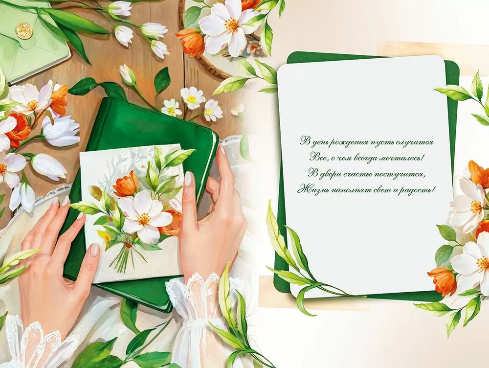 Открытка «С Днем рождения!» в формате А5 станет прекрасным дополнением к подарку и украсит любое поздравление. Необыкновенно красивый дизайн обязательно порадует любую именинницу! На изделии изображены нежные цветы, зеленый ежедневник и руки, которые уже готовы сделать очередную запись о своих мечтах в этой тетради. Внутри открытки – замечательные стихи с теплыми пожеланиями. Такой презент можно вручить в дополнение к основному подарку, чтобы украсить поздравление и сделать его более оригинальным. Изделие выполнено из качественных материалов, что обеспечивает ему прочность и долговечность, поэтому оно станет чудесным памятным сувениром для получателя.