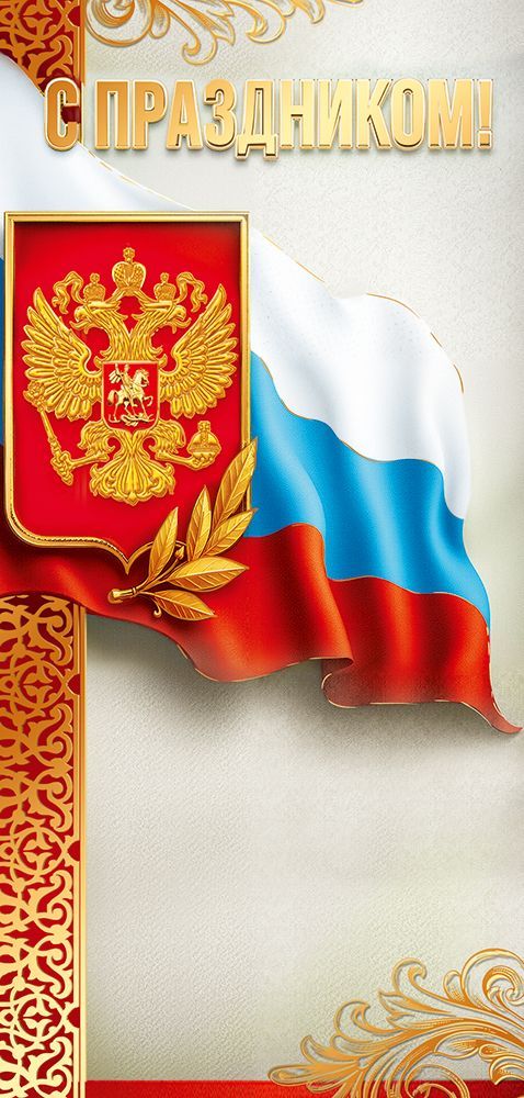 Открытка формата евро изготовлена из плотного картона, обеспечивающего стабильную геометрию изделия при хранении, транспортировке и массовой рассылке. Готовое изделие имеет длину 204 мм и ширину 97 мм, что позволяет использовать открытку в стандартных конвертах соответствующего формата и облегчает планирование почтовых отправлений и складских ячеек. Лицевая сторона оформлена в официально-деловом стиле: изображены государственная символика, триколор и поздравительная надпись «С ПРАЗДНИКОМ!», что делает изделие универсальным для государственных и корпоративных торжеств, профессиональных праздников, памятных дат и официальных поздравлений партнеров, сотрудников и клиентов. Применена отделка фольгой золотой, за счет чего отдельные элементы дизайна имеют выраженный металлический блеск и визуально выделяются на фоне, оставаясь при этом устойчивыми к истиранию при аккуратной эксплуатации. Внутренняя сторона без текста, с чистым полем для нанесения индивидуальных поздравлений, печати фирменных обращений, штампов и подписей от руки, что удобно как для розничного пользователя, так и для организаций, формирующих серию типовых поздравлений. Картонная основа подходит для нанесения надписей шариковыми и гелевыми ручками, маркерами и штемпельными чернилами без значительного просвечивания. Открытка поставляется по 10 штук, что оптимально для оптовых закупок с последующим распределением по подразделениям или торговым точкам, а также позволяет формировать равномерный запас на складе, упрощая учет и планирование сезонного ассортимента. Компактный размер и плоская конструкция способствуют рациональному использованию складского пространства и уменьшению риска деформации при транспортировке в коробах и почтовых отправлениях.