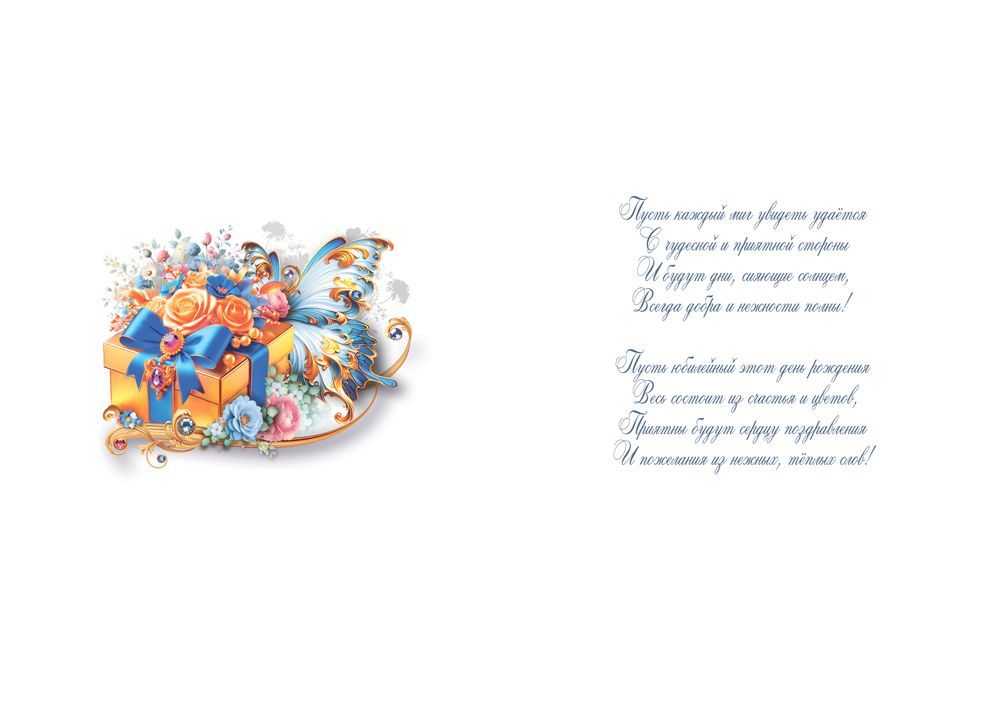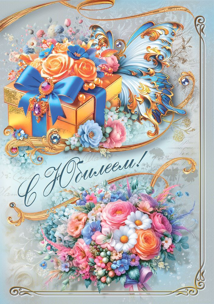 Открытка формата А4 предназначена для поздравления с юбилеем и ориентирована на использование в розничной продаже и оптовых поставках для торговых сетей, канцелярских отделов и сувенирных магазинов. Изделие выполнено из плотного картона, устойчивого к изгибам и истиранию, что обеспечивает сохранение формы при транспортировке, выкладке и длительном хранении на стеллажах. Лицевая сторона оформлена полноцветным изображением подарочной коробки с цветочной композицией и крупным букетом на светлом фоне, дополненным декоративными элементами; композиция читается с расстояния и хорошо выделяется в витринной выкладке. Применена золотая фольга для акцентирования рамки, элементов подарочной коробки, деталей бабочки и отдельных контуров цветов, а также глянцевый УФ-лак, создающий выборочное повышение блеска и обеспечивающий дополнительную защиту печати от истирания и влаги. Такое сочетание отделок повышает износостойкость лицевой стороны при частом перелистывании и контакте с руками покупателей. Внутри размещён заранее напечатанный поздравительный текст с обращением к юбиляру, что сокращает время подготовки к вручению и делает открытку удобной для покупателей, приобретающих её в условиях ограниченного времени. Габаритные размеры готового изделия: длина 277 мм, ширина 196 мм, что соответствует увеличенному формату и позволяет разместить крупное изображение и разборчивый текст без перегрузки макета. Открытка поставляется тиражом по 10 штук, что упрощает формирование заказов для оптовых клиентов, позволяет планировать выкладку по цветовой и тематической группе «Юбилей» и оптимизировать складские остатки. Плоская конструкция изделия удобна для штабелирования, транспортировки в коробах стандартного размера и хранения в вертикальных или горизонтальных дисплеях. Нейтральная цветовая гамма с преобладанием пастельных тонов и универсальный сюжет делают открытку подходящей для поздравления юбиляров разного возраста, как женщин, так и мужчин, в личных и деловых ситуациях.
