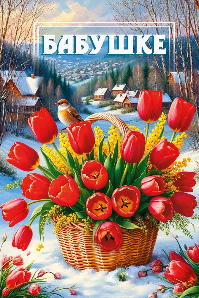 Открытка формата А5 предназначена для поздравления бабушки и ориентирована на использование в розничных продажах и оптовых поставках для праздничного ассортимента. Изделие выполнено из плотного картона, что обеспечивает стабильную геометрию при длине 182 мм и ширине 122 мм, устойчивость к изгибам и истиранию в процессе транспортировки, выкладки и хранения. Лицевая сторона оформлена полноцветным изображением зимнего пейзажа с деревенскими домами, корзиной с красными тюльпанами и мимозой, а также крупной надписью «БАБУШКЕ», что делает назначение открытки однозначным и удобным при подборе ассортимента к семейным и календарным праздникам. Поверхность покрыта глянцевым УФ-лаком, за счет чего изображение устойчиво к выцветанию, сохраняет яркость при длительном хранении на складе и в торговом зале, а также менее подвержено загрязнениям и мелким механическим повреждениям. Внутри размещен печатный текст поздравления, что сокращает время подготовки к продаже и использованию: открытка готова к вручению, достаточно дополнить ее личной подписью. Плотный картон и стандартный формат позволяют размещать изделие в универсальных конвертах и на большинстве торговых стоек, удобно комплектовать наборы для сезонных акций. В упаковке 10 одинаковых открыток, что облегчает планирование закупок, формирование витрины и поддержание единого стиля поздравительной продукции. Изделие подходит для розничной продажи поштучно, для формирования подарочных наборов с цветами, сладостями или сувенирами, а также для использования в организациях при подготовке поздравлений сотрудникам и партнерам старшего поколения.